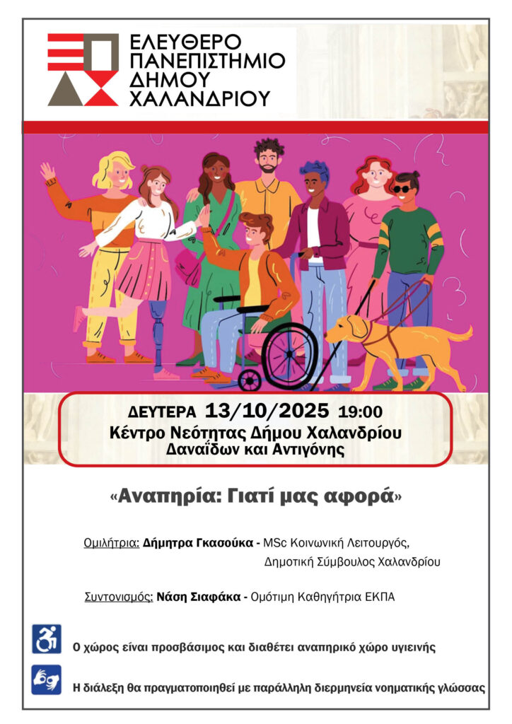 Τη Δευτέρα 13/10 και ώρα 19:00 στο Κέντρο Νεότητας (Δαναΐδων & Αντιγόνης) το Ελεύθερο Πανεπιστήμιο του Δήμου Χαλανδρίου φιλοξενεί την πολύ μεγάλης κοινωνικής σημασίας εκδήλωση με θέμα: «Αναπηρία: Γιατί μας αφορά;»