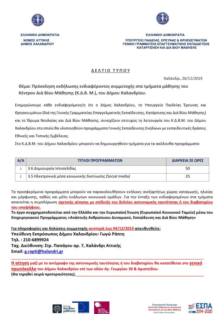 Πρόσκληση εκδήλωσης ενδιαφέροντος συμμετοχής στα τμήματα μάθησης του Κέντρου Διά Βίου Μάθησης (Κ.Δ.Β. Μ.), του Δήμου Χαλανδρίου