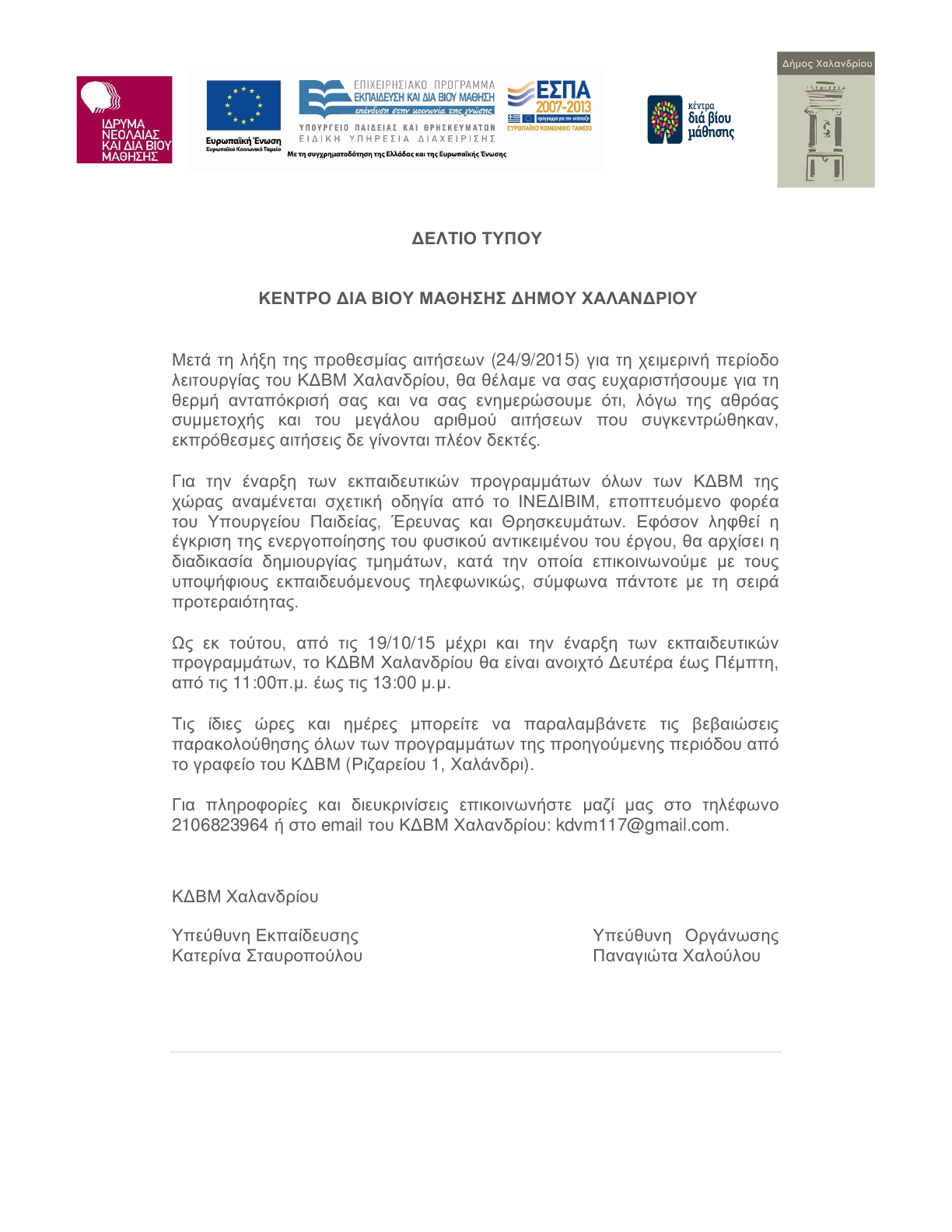 Δελτίο τύπου ΚΔΒΜ – Σεπτέμβριος 2015
