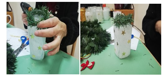 1.Αφού έχουμε καθαρίσει το βαζάκι με ένα πινέλο, απλώνουμε την κόλλα σε όλη την επιφάνεια και κολλάμε διάφορα σχεδιάκια (αστεράκια και χιονονιφάδες).