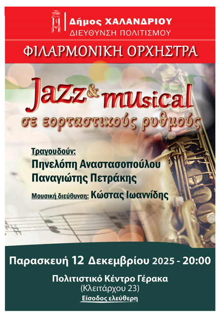 Η Φιλαρμονική Ορχήστρα του Δήμου Χαλανδρίου προσκαλεί το κοινό σε μια ξεχωριστή μουσική εμπειρία με jazz και musical αποχρώσεις, την Παρασκευή 12 Δεκεμβρίου, στις 20:00, στο Πολιτιστικό Κέντρο Γέρακα (Κλειτάρχου 23).