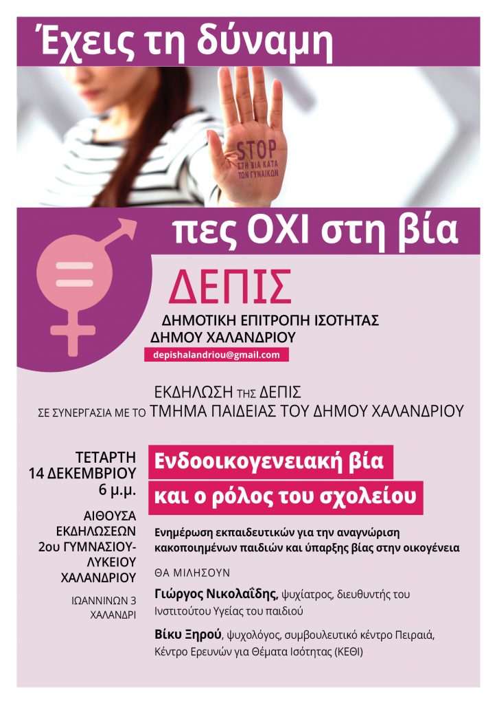 Στο πλαίσιο των εκδηλώσεων για την παγκόσμια ημέρα Εξάλειψης της Βίας κατά των Γυναικών, στις 25 Νοεμβρίου, η Δημοτική Επιτροπή Ισότητας Χαλανδρίου, σε συνεργασία με τη Διεύθυνση Παιδείας του Δήμου Χαλανδρίου, οργανώνει εκδήλωση με θέμα: «Ενδοοικογενειακή βία και ο ρόλος του σχολείου», την Τετάρτη 14 Δεκεμβρίου, στην αίθουσα του 2ου Γυμνασίου – Λυκείου Χαλανδρίου (Ιωαννίνων 3), στις 18.00.