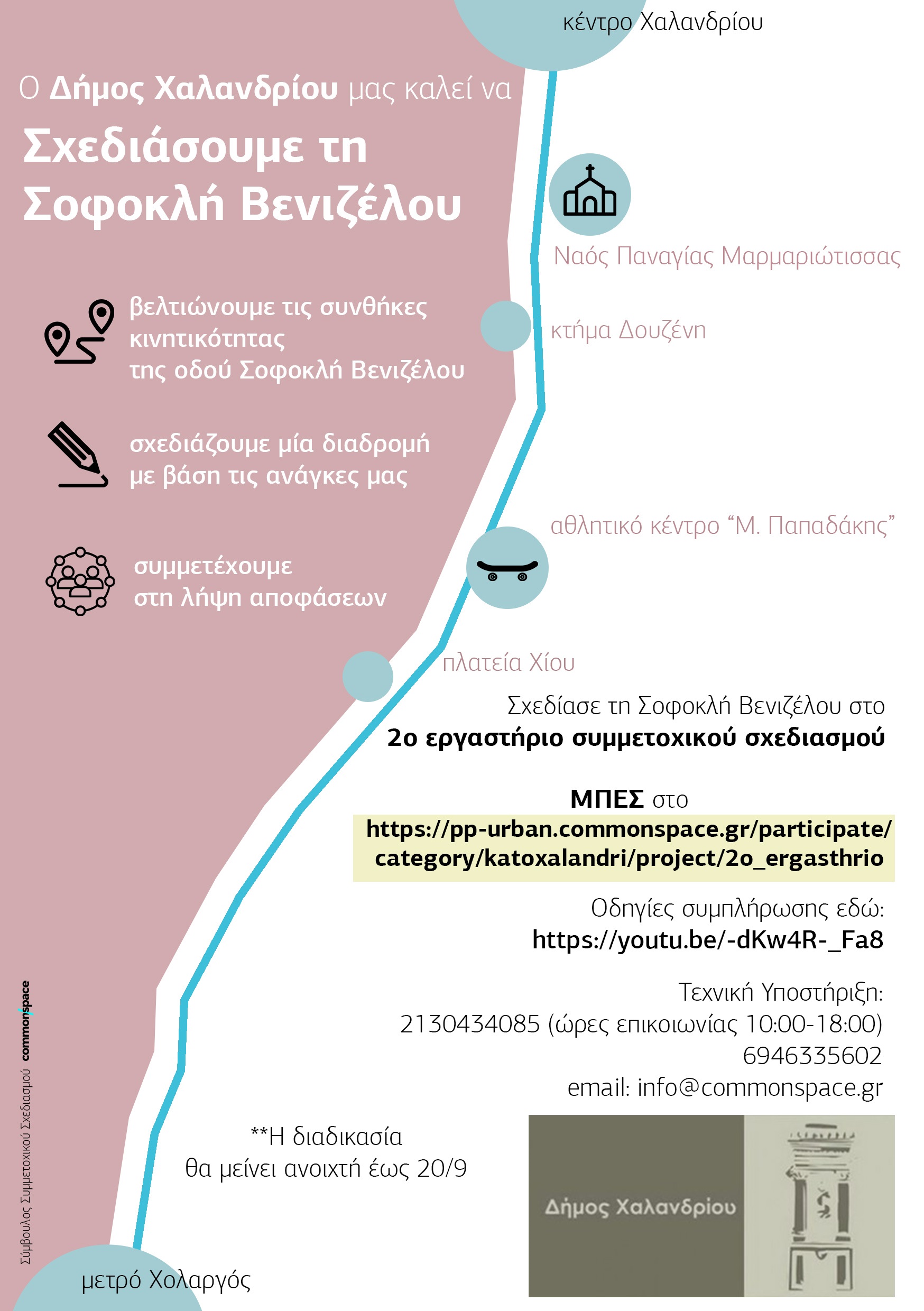 Για τεχνική υποστήριξη καλούμε στα τηλ.: 2130434085 (ώρες επικοινωνίας 10:00-18:00) 6946335602 ή στέλνουμε email στο info@commonspace.gr