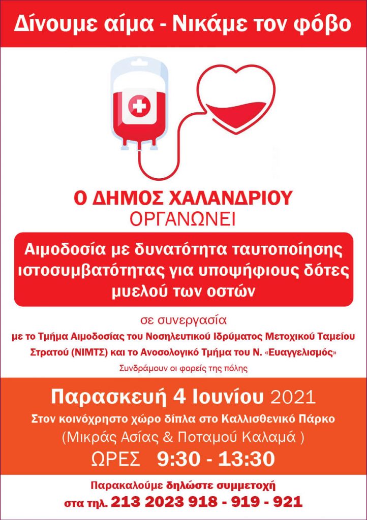 Εθελοντική αιμοδοσία και έλεγχο ιστοσυμβατότητας για υποψήφιους δότες μυελού των οστών διοργανώνει ο Δήμος Χαλανδρίου, σε συνεργασία με το Τμήμα