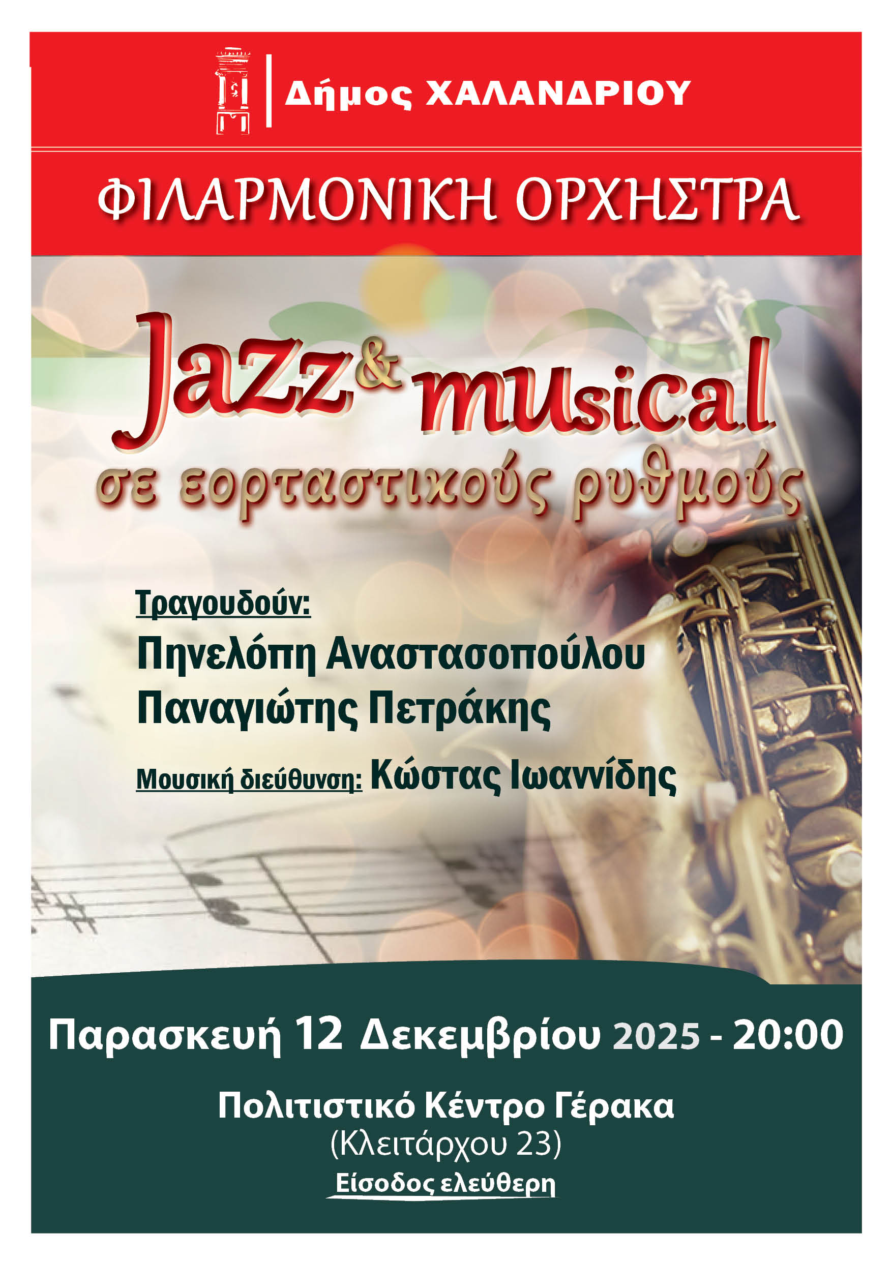 Η Φιλαρμονική Ορχήστρα του Δήμου Χαλανδρίου σας προσκαλεί σε μια μοναδική μουσική βραδιά σε jazz, musical ρυθμούς, την Παρασκευή 12 Δεκεμβρίου, στις 20:00, στο Πολιτιστικό Κέντρο Γέρακα (Κλειτάρχου 23).