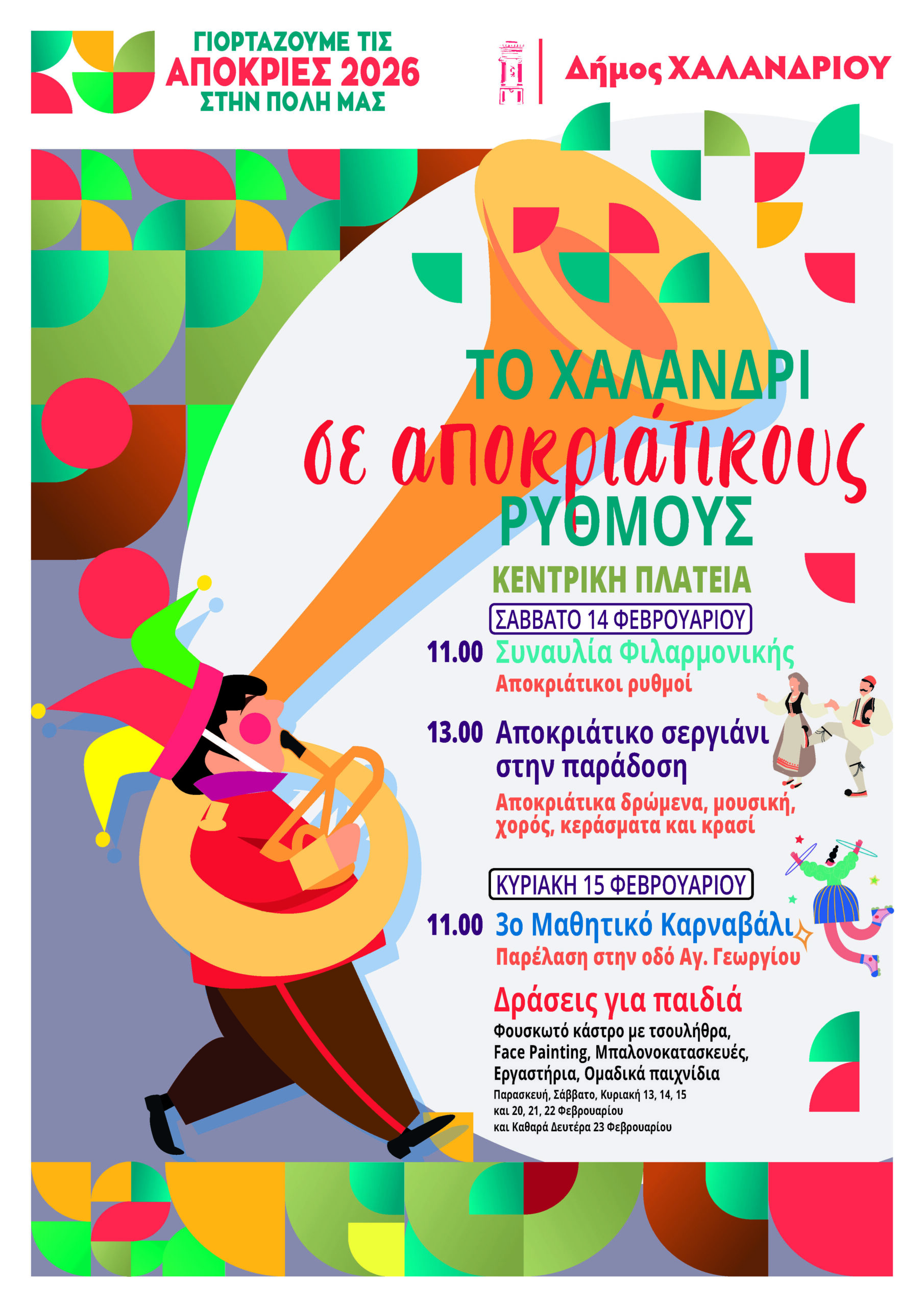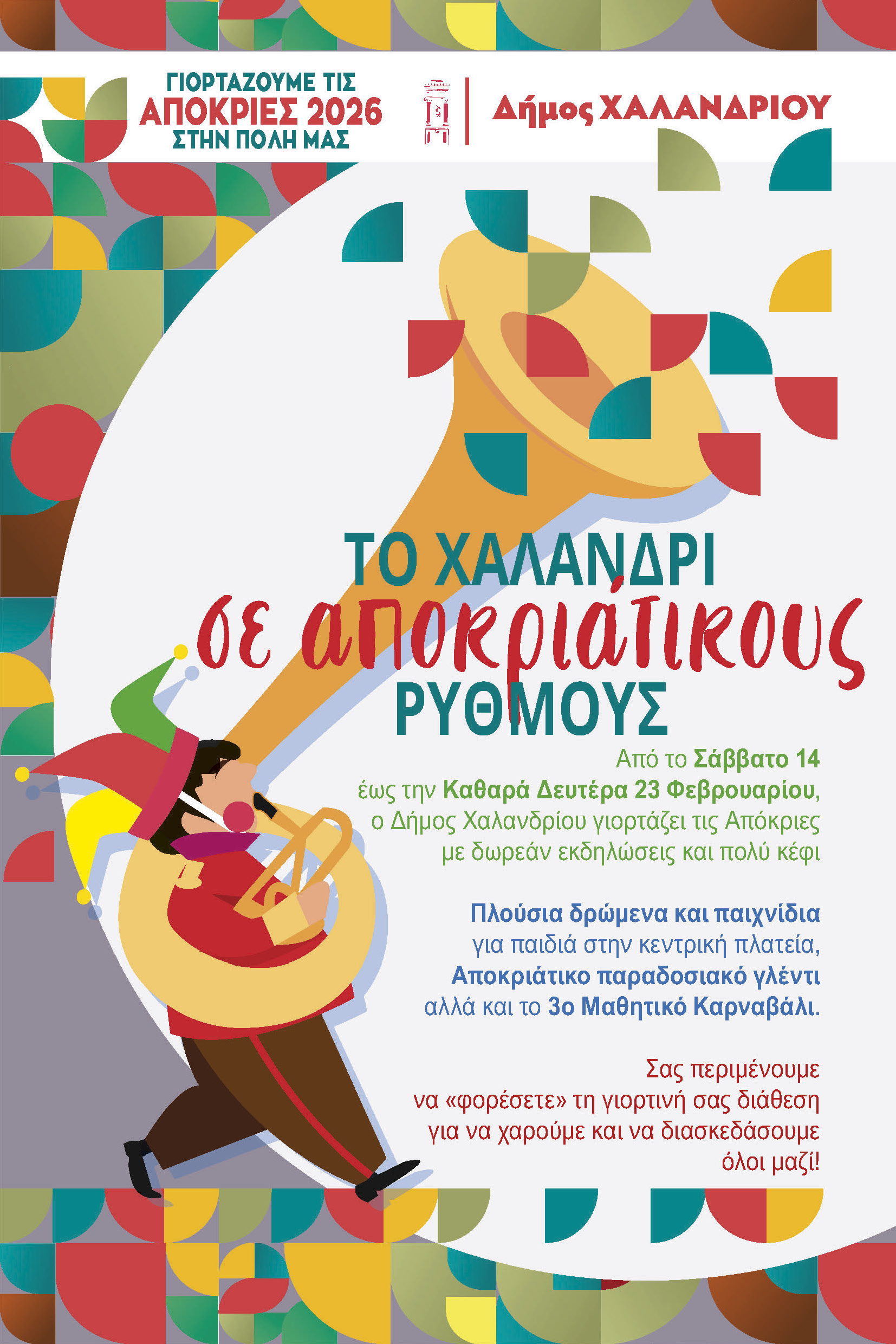 Με δωρεάν εκδηλώσεις για όλους και πολύ κέφι, ο Δήμος Χαλανδρίου γιορτάζει και φέτος τις Απόκριες και προσκαλεί κατοίκους και επισκέπτες σε ένα γιορτινό ταξίδι γεμάτο χαρά, κέφι, παράδοση και δημιουργία, με επίκεντρο την Κεντρική Πλατεία.