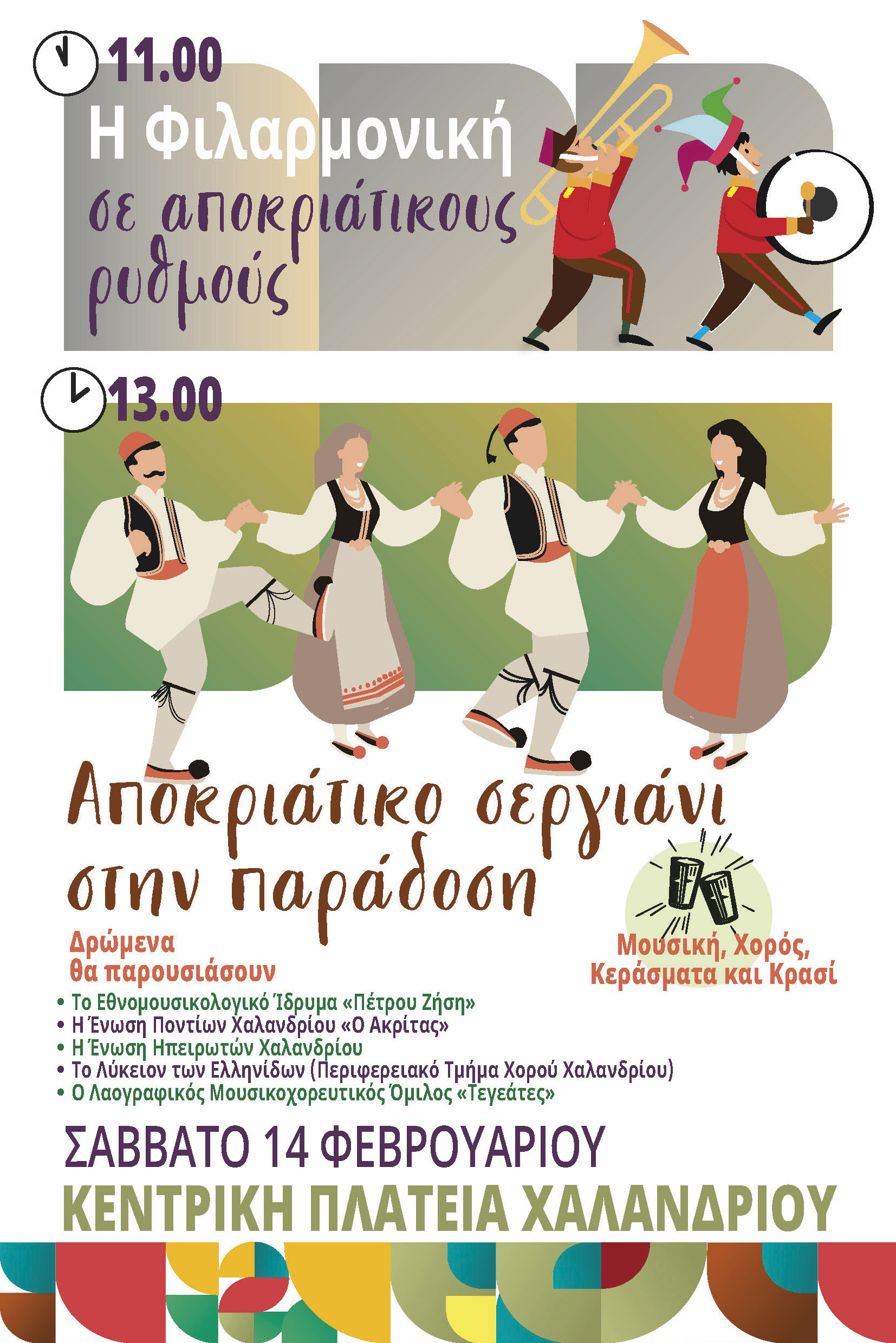Η Φιλαρμονική Ορχήστρα του Δήμου Χαλανδρίου θα δώσει τον δικό της εορταστικό τόνο στην Κεντρική Πλατεία. Με ένα πρόγραμμα γεμάτο ζωντάνια και αγαπημένες μελωδίες, οι μουσικοί του Δήμου θα μεταφέρουν το γιορτινό κλίμα της Αποκριάς σε μικρούς και μεγάλους.