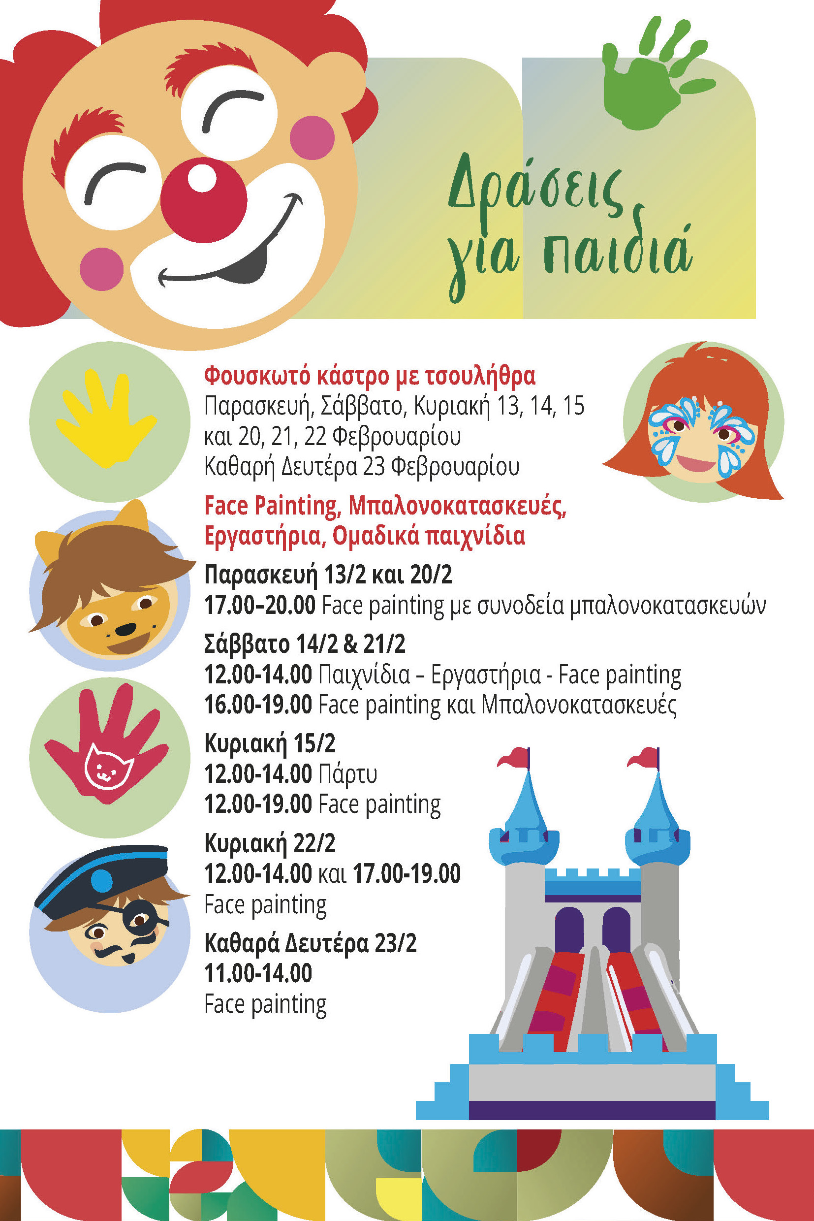 Θα λειτουργήσει Παρασκευή, Σάββατο και Κυριακή 13, 14, 15 Φεβρουαρίου και 20, 21, 22 Φεβρουαρίου καθώς και την Καθαρά Δευτέρα 23 Φεβρουαρίου. - Face painting, μπαλονοκατασκευές, δημιουργικά εργαστήρια και ομαδικά παιχνίδια