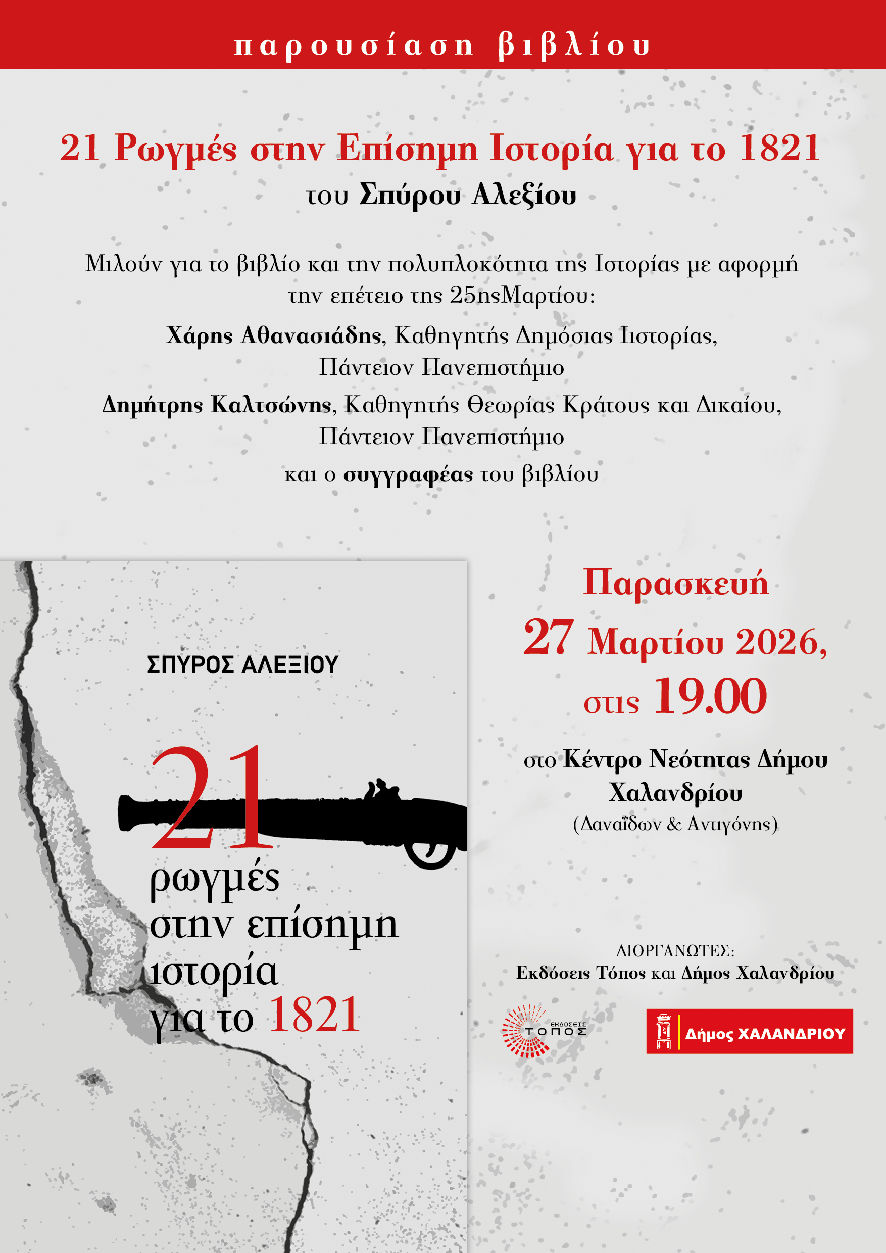 Ο Δήμος Χαλανδρίου και οι εκδόσεις «Τόπος» διοργανώνουν, με αφορμή την επέτειο της 25ης Μαρτίου, την εκδήλωση «21 Ρωγμές στην Επίσημη Ιστορία για το 1821», την Παρασκευή 27 Μαρτίου 2026, στο Κέντρο Νεότητας του Δήμου (Δαναΐδων & Αντιγόνης), στις 19.00, με τη συμμετοχή διακεκριμένων πανεπιστημιακών.