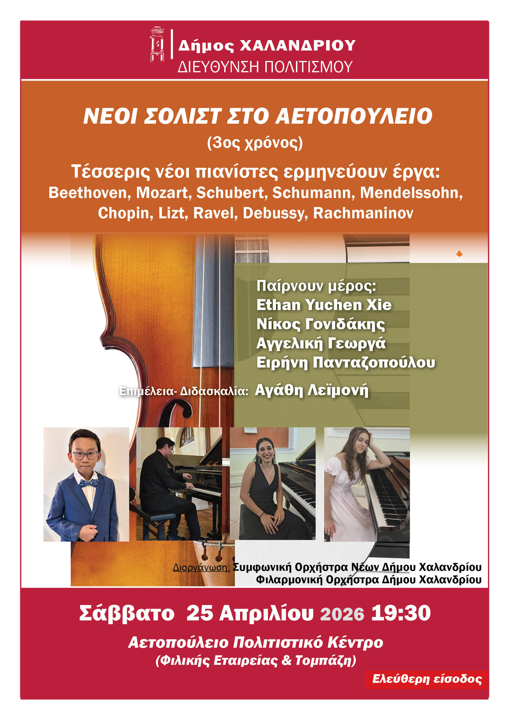 Αυτό το Σάββατο 25 Απριλίου, στις 19.30, τέσσερις νέοι πιανίστες έρχονται στο Αετοπούλειο, στο πλαίσιο κύκλου συναυλιών «Νέοι σολίστ», για να ερμηνεύουν έργα Beethoven, Mozart, Schubert, Schumann, Mendelssohn, Chopin, Lizt, Ravel, Debussy και Rachmaninov.