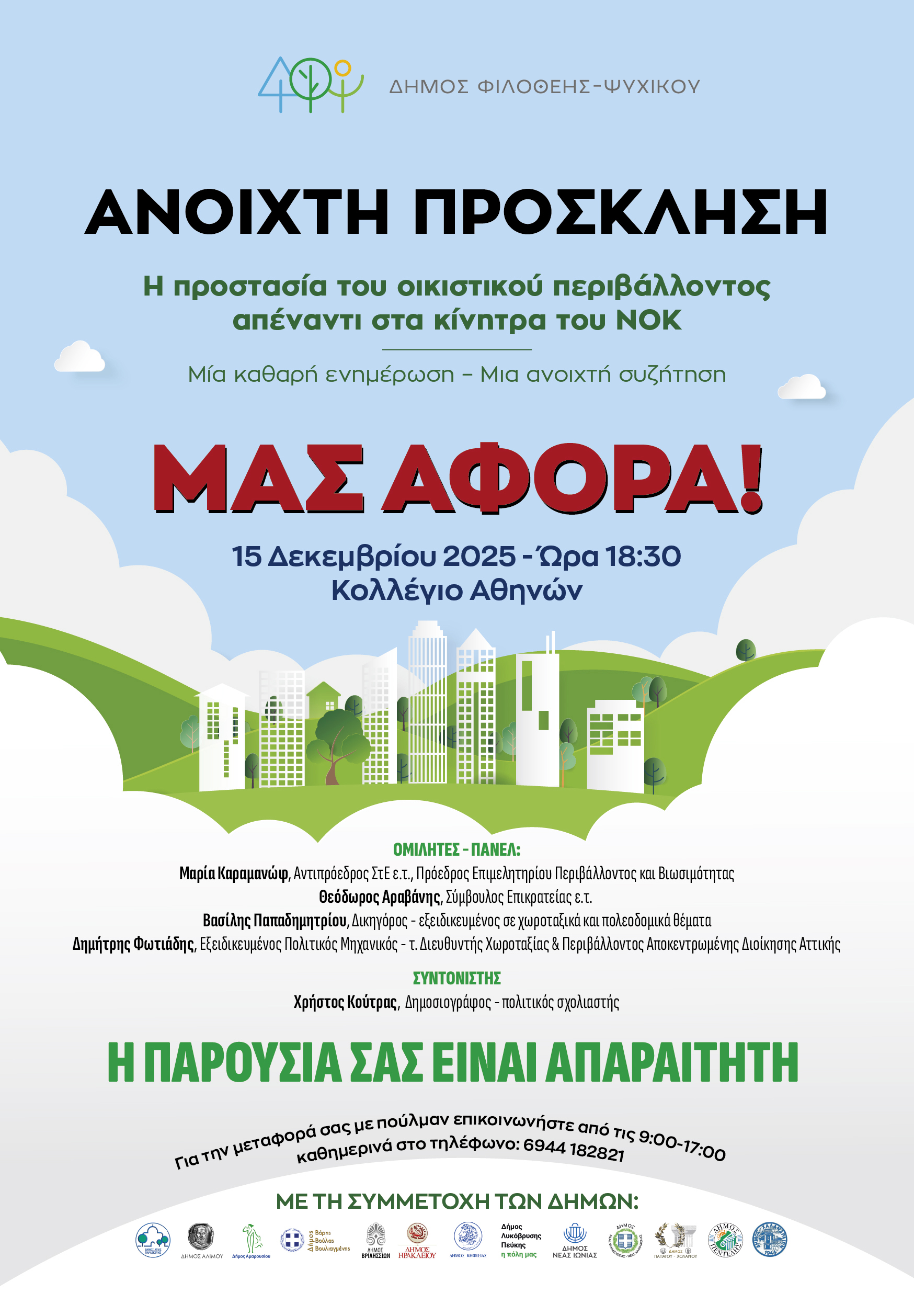 Ο Δήμος Χαλανδρίου συμμετέχει στην εκδήλωση «Η Προστασία του οικιστικού περιβάλλοντος απέναντι στα κίνητρα του ΝΟΚ», η οποία θα πραγματοποιηθεί στο Κολλέγιο Αθηνών, τη Δευτέρα 15.12.2025 και ώρα 18.30.