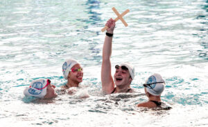 Μαθητές και μαθήτριες των ακαδημιών κολύμβησης του Δήμου βούτηξαν για το σταυρό, τον οποίο έπιασε η μαθήτρια του 2ου Γυμνασίου Χαλανδρίου, Ιόλη Κοτενίδη.