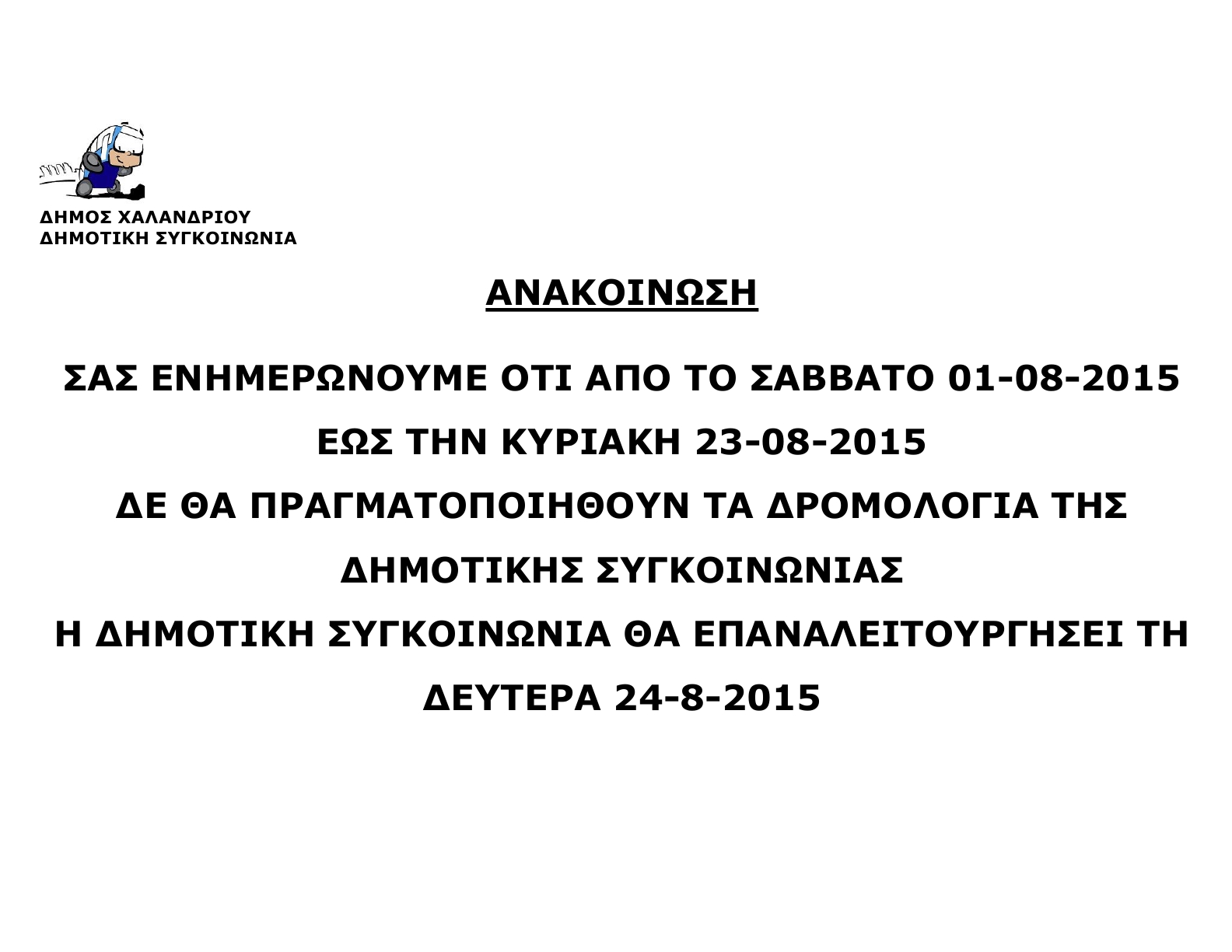 ΑΝΑΚΟΙΝΩΣΗ Το Τμήμα Συγκοινωνιών & Κυκλοφορίας της Δ/νσης Τεχνικών Υπηρεσιών του Δήμου Χαλανδρίου, σας ενημερώνει ότι: ΣΑΒΒΑΤΟ 28/12/2024 ΠΕΜΠΤΗ 02/01/2025