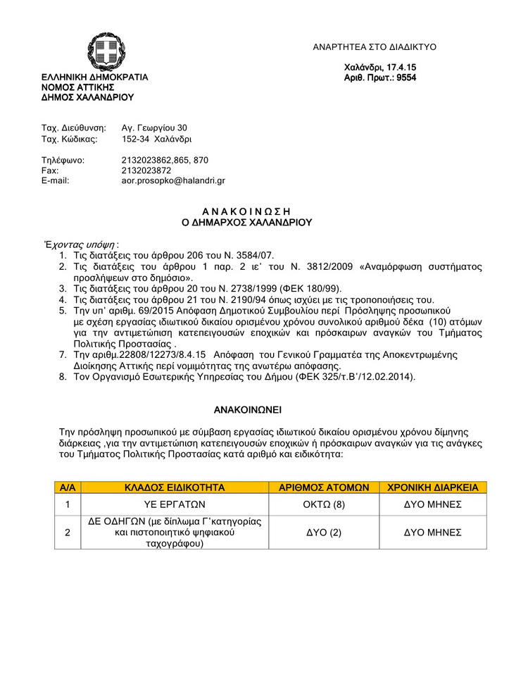 Η κατάθεση των αιτήσεων για την κάλυψη των θέσεων για τις ανάγκες της Πολιτικής Προστασίας είναι από την Τρίτη 21/4/15 έως και Παρασκευή 24/4/15.