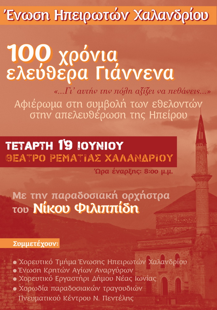 Πατήστε στην αφίσα για μεγέθυνση | Ένωση Ηπειρωτών Χαλανδρίου 100 χρόνια «…Γι’ αυτήν την πόλη αξίζει να πεθάνεις…» Αφιέρωμα στη συμβολή των εθελοντών ΤΕΤΑΡΤΗ 19 ΙΟΥΝΙΟΥ Ώρα έναρξης: 8:00 μ.μ. Με την παραδοσιακή ορχήστρα Συμμετέχουν