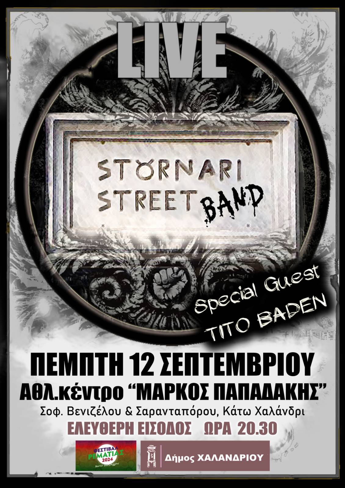 Μια ακόμα συναυλία, στο πλαίσιο του Φεστιβάλ Ρεματιάς, θα πραγματοποιήσουν οι Stournari Street Band, την Πέμπτη 12 Σεπτεμβρίου 2024, στις 20.30, στο Αθλητικό Κέντρο “Μ. Παπαδάκης”, με ελεύθερη είσοδο.