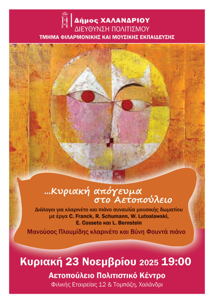 Την Κυριακή 23 Νοεμβρίου στις 19.00 θα δοθεί συναυλία μουσικής δωματίου για κλαρινέτο και πιάνο με έργα C.Frank, R. Schumann, W.Lutoslawski, E.Cosseto Και L. Bernstein.