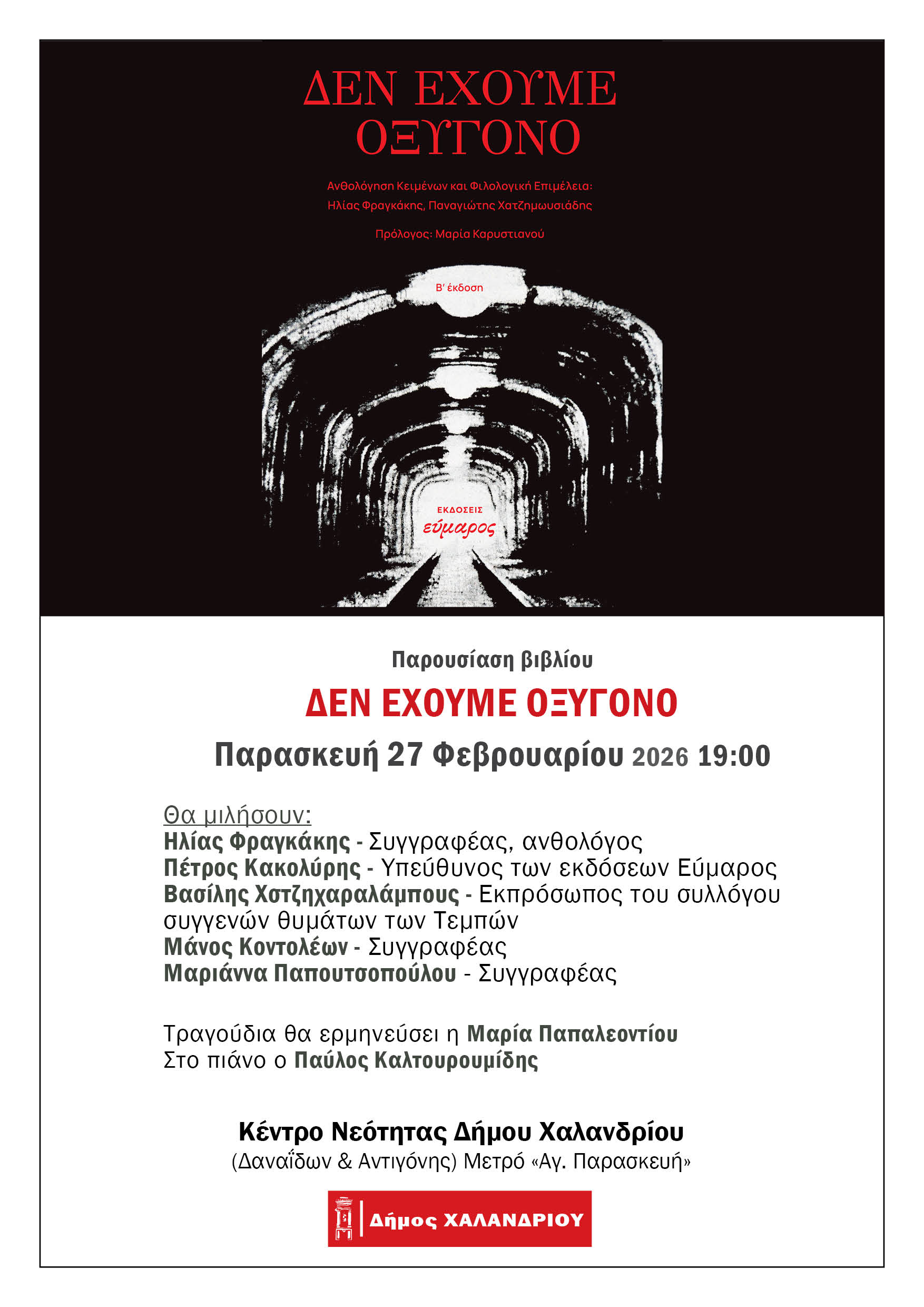 Το βιβλίο «Δεν έχουμε οξυγόνο» των εκδόσεων Εύμαρος παρουσιάζει ο Δήμος Χαλανδρίου την Παρασκευή 27 Φεβρουαρίου, με αφορμή τη «μαύρη» επέτειο (28/2) του σιδηροδρομικού δυστυχήματος στα Τέμπη, στις 19.00, στο Κέντρο Νεότητας (Δαναΐδων και Αντιγόνης).