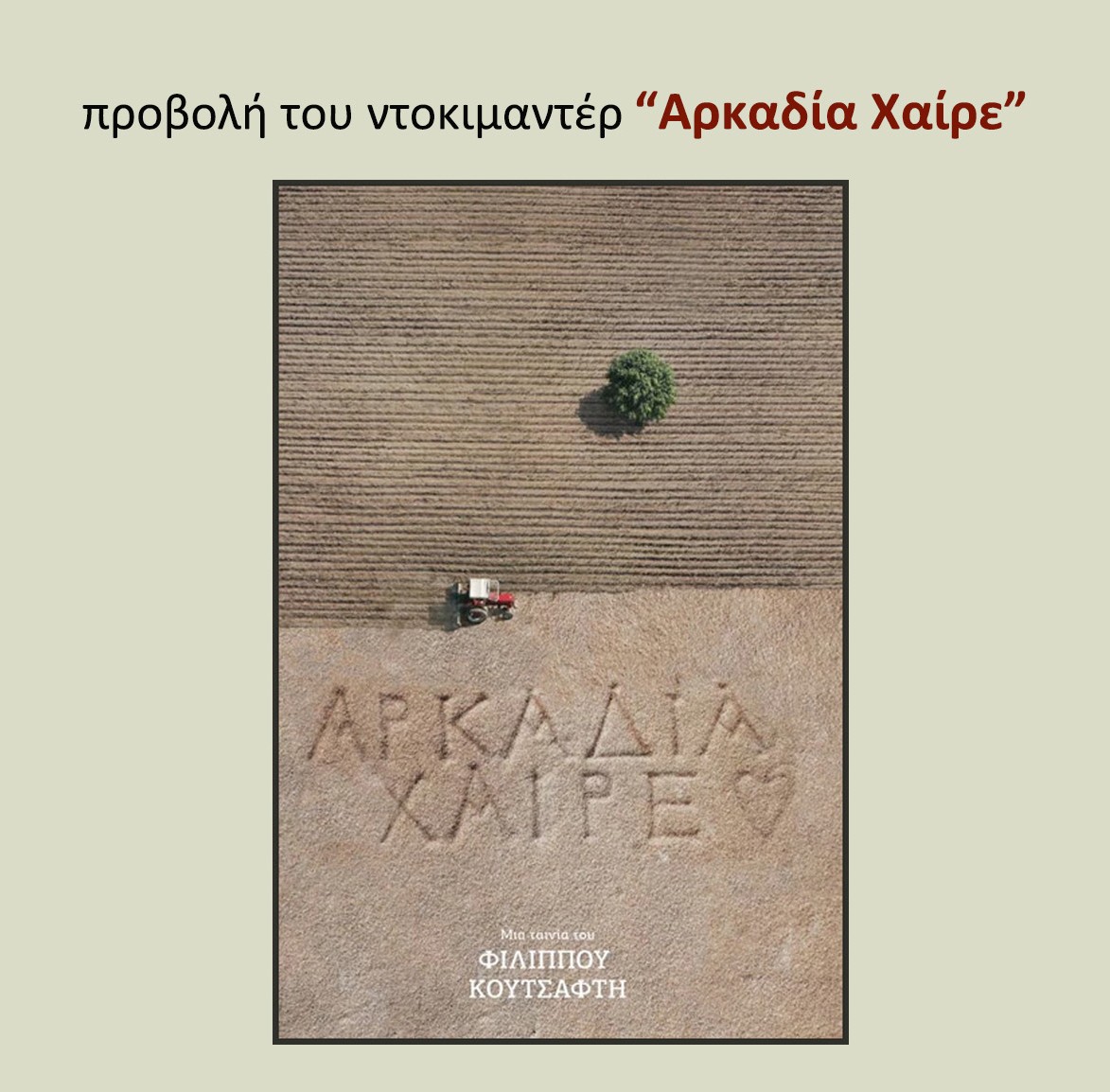 Θα προβληθεί το ντοκιμαντέρ του «Αρκαδία Χαίρε» και θα ακολουθήσει συζήτηση με τον σκηνοθέτη.