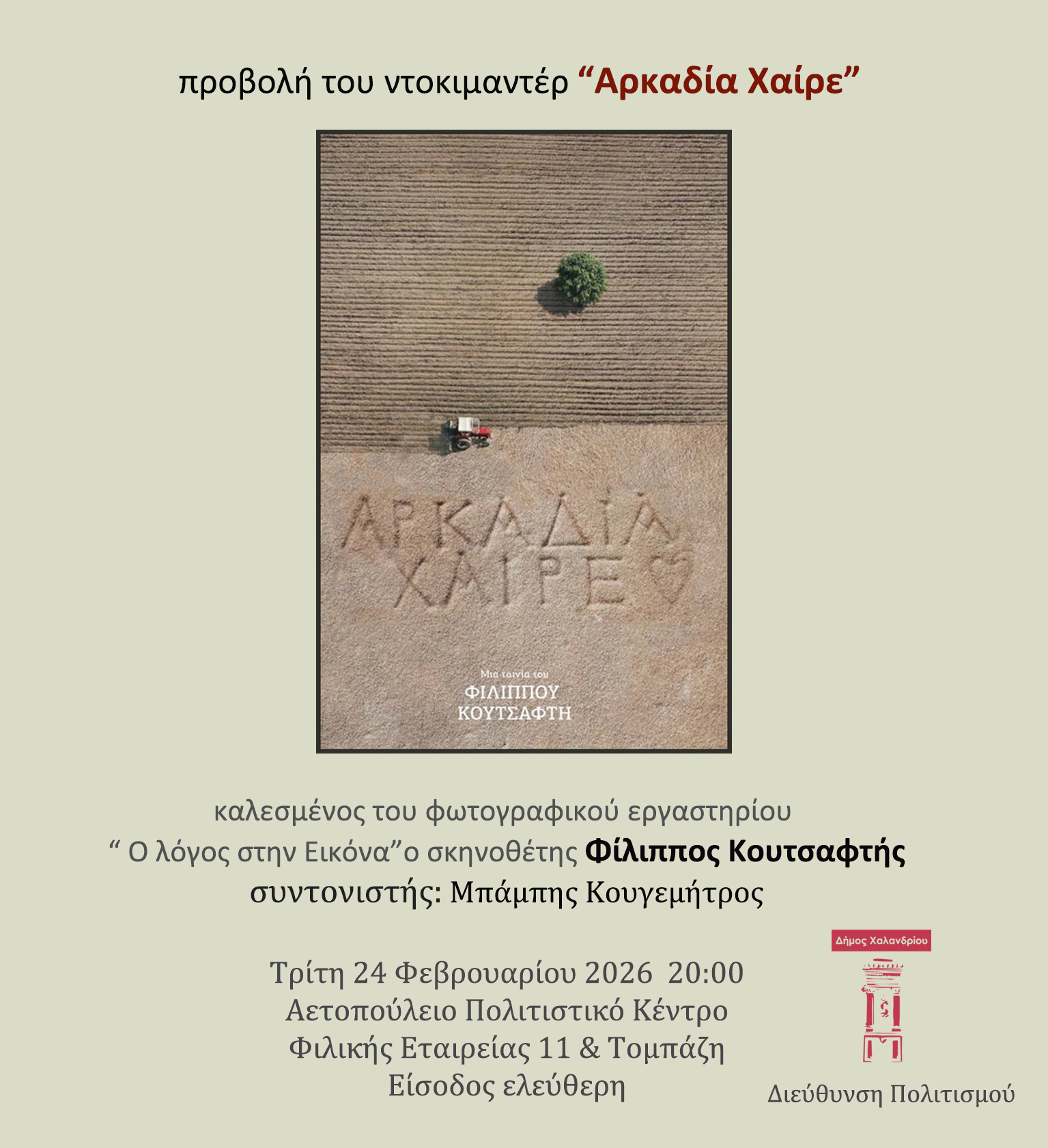 Home » Το φωτογραφικό εργαστήριο του Δήμου Χαλανδρίου φιλοξενεί τον σκηνοθέτη Φίλιππο Κουτσαφτή – Θα προβληθεί η ταινία του «Αρκαδία Χαίρε» » Filippos Koutsaftis