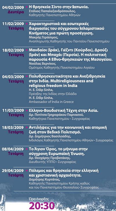 ![]() | Αετοπούλειο Πολιτιστικό Κέντρο Δήμου Χαλανδρίου Καλλιτεχνική περίοδος Χειμώνας 2008 -ʼνοιξη 2009 4 Φεβρουαρίου 2008 – 29 Απριλίου 2009 Σειρά ομιλιών με θέμα: «Θρησκεία & Πολιτισμός» |