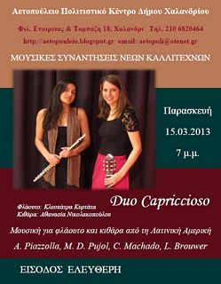 Την Παρασκευή 15 Μαρτίου 2013, θα πραγματοποιηθεί η συναυλία «Μουσική για φλάουτο και κιθάρα από τη Λατινική Αμερική», στην αίθουσα του Αετοπούλειου (Φιλ. Εταιρείας & Τομπάζη 18, Χαλάνδρι τηλ. 210 6820464) και ώρα 7μ.μ.