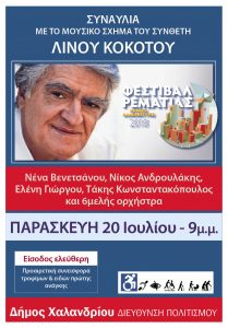 Μια μοναδική μουσική βραδιά με αγαπημένα τραγούδια του συνθέτη Λίνου Κόκοτου θα έχουν την ευκαιρία να απολαύσουν οι φίλες και οι φίλοι της Ρεματιάς την Παρασκευή 20 Ιουλίου. Η συναυλία που φιλοξενεί το Φεστιβάλ Ρεματιάς 2018 – Νύχτες Αλληλεγγύης θα ξυπνήσει τρυφερές αναμνήσεις από την ένδοξη εποχή των πλακιώτικων μπουάτ και το «Νέο Κύμα» που ανέδειξαν πρωταγωνιστική μορφή τον Λίνο Κόκοτο με γνωστά και αγαπημένα τραγούδια όπως «Το Θαλασσινό Τριφύλλι», «Γειτονάκι μου», «Μικρό παιδί», «Κορίτσια με τα παντελόνια», «Το Δελφινοκόριτσο». Κατά τη διάρκεια της βραδιάς θα παρουσιαστούν και τραγούδια από τη νέα δισκογραφική δουλειά του συνθέτη «Ανεμογυαλός».