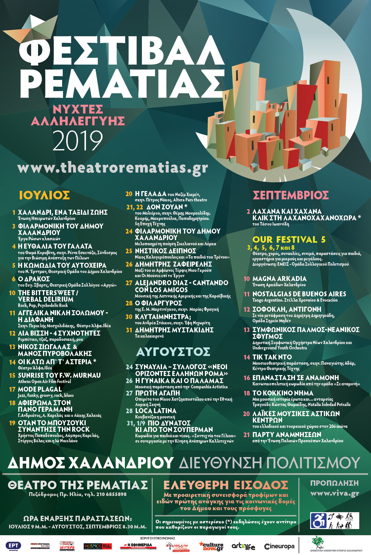 Το Φεστιβάλ Ρεματιάς 2019 – Νύχτες Αλληλεγγύης περιλαμβάνει 64 εκδηλώσεις από όλο το φάσμα των παραστατικών τεχνών, από τις οποίες εισιτήριο έχουν μόνο οι τέσσερις (οι οποίες αποτελούν παραχώρηση του θεάτρου από τον δήμο στις αντίστοιχες παραγωγές και εκείνες καθορίζουν το εισιτήριο) ενώ το πρόγραμμα «ανοίγουν» και φέτος οι φορείς της πόλης με τις δικές τους εκδηλώσεις που θα διαρκέσουν από την 1η μέχρι τις 6 Ιουλίου.