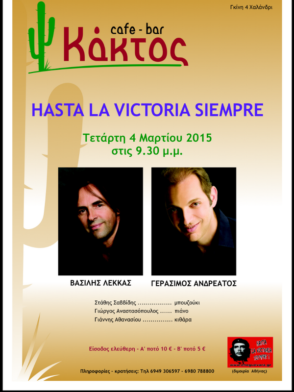 Αυτή την Τετάρτη, ο Βασίλης Λέκκας και ο Γεράσιμος Ανδρεάτος θα βρεθούν στο Χαλάνδρι ως αναπόσπαστο κομμάτι των Hasta La Victoria Siempre να παρουσιάσουν την κοινωνική δράση της ομάδας καθώς και να μοιραστούν πολλά από τα τραγούδια τους. Θα είμαστε εκεί.