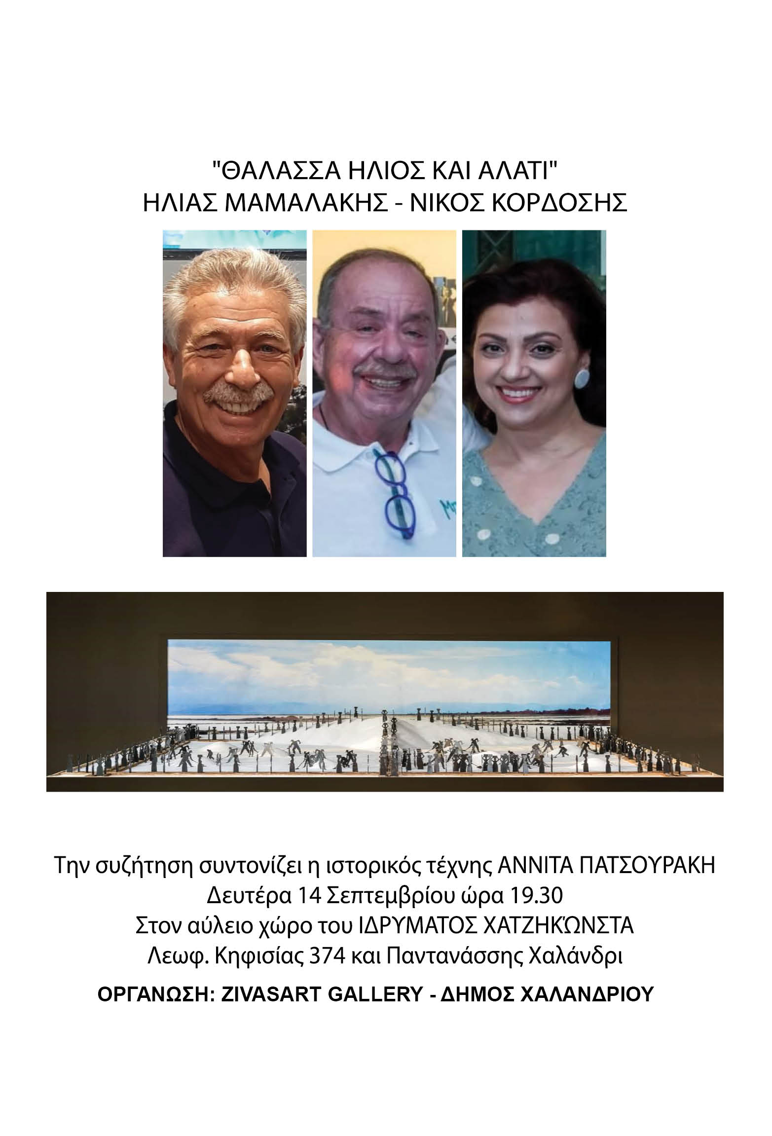 Η Zivasart Gallery και ο Δήμος Χαλανδρίου διοργανώνουν τη Δευτέρα 14 Σεπτεμβρίου στις 7:30 το βράδυ στον ανοιχτό αύλειο χώρο του Ιδρύματος Χατζηκώνστα μία ενδιαφέρουσα και πρωτότυπη συνάντηση – συνομιλία με θέμα “Θάλασσα, Ήλιος και Αλάτι”. Συνομιλητές ο αγαπητός σε όλους Ηλίας Μαμαλάκης και ο ιδρυτής του μοναδικού Μουσείου Άλατος στο Μεσολόγγι, Νίκος Κορδόσης. Τον διάλογο θα συντονίσει η ιστορικός τέχνης Αννίτα Πατσουράκη.