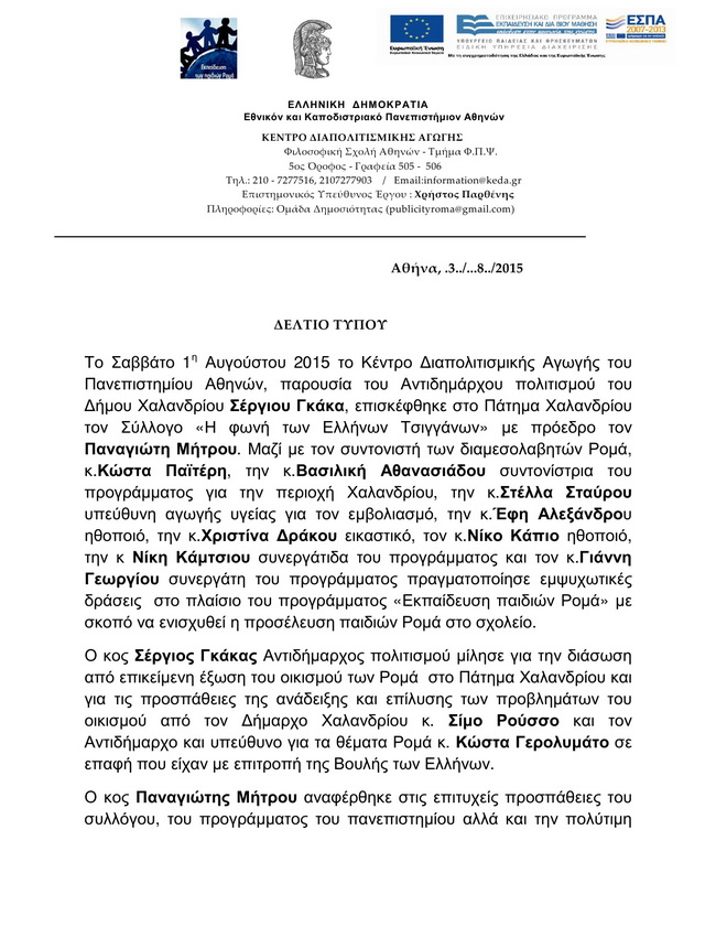 Δελτίο τύπου απο τη συνάντηση στο πλαίσιο του προγράμματος «Εκπαίδευση παιδιών Ρομά» με σκοπό να ενισχυθεί η προσέλευση παιδιών Ρομά στο σχολείο