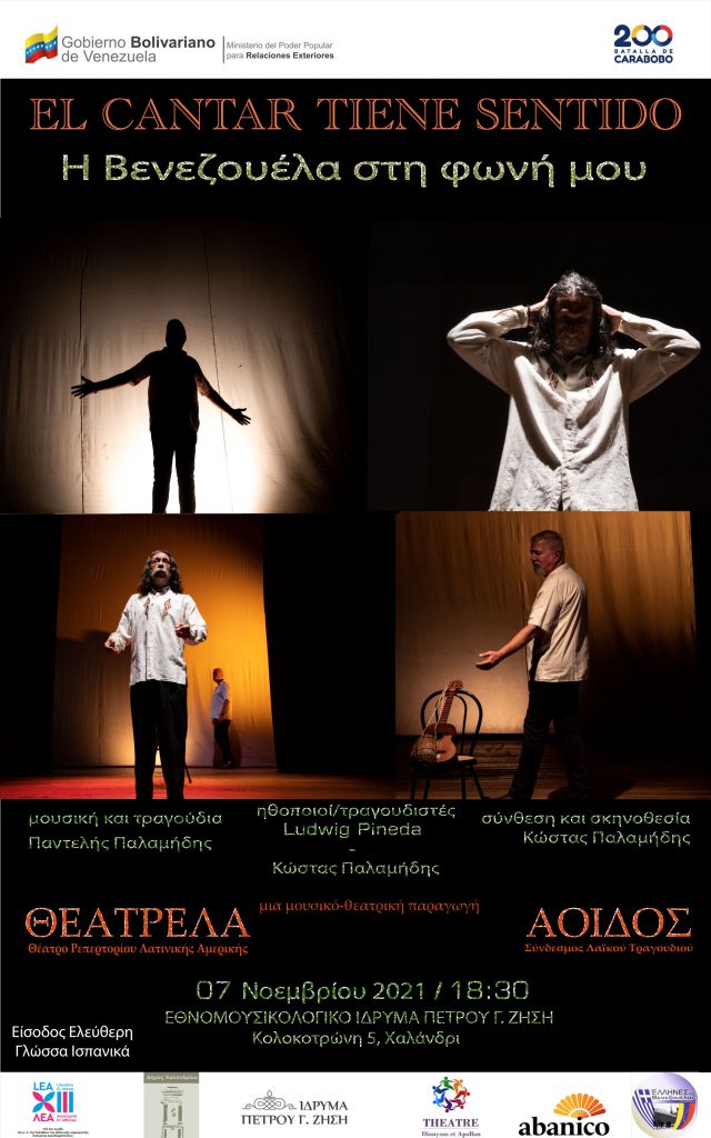 Η πρεσβεία της Μπολιβαριανής Δημοκρατίας της Βενεζουέλας, με τη στήριξη του Δήμου Χαλανδρίου, γιορτάζοντας τη νέα Εθνική Μέρα Θεάτρου της χώρας καθώς και τη δυναμική που του προσέδωσε ο Σιμόν Μπολιβάρ, παρουσιάζει τη μουσικοθεατρική παράσταση «Η Βενεζουέλα στη φωνή μου- El cantar tiene sentido», στο πλαίσιο του 13ου Φεστιβάλ Ελληνο-Ιβηροαμερικανικής «Λογοτεχνίας εν Αθήναις».