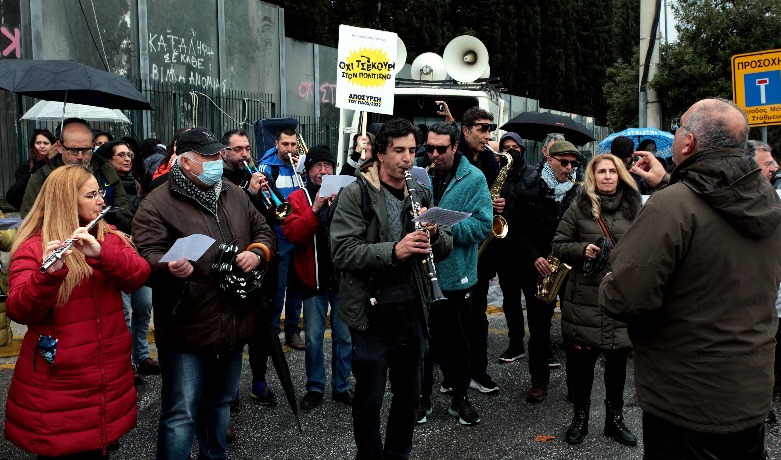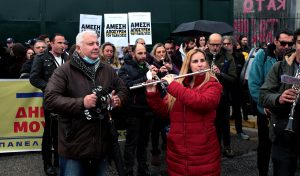 Την έμπρακτη υποστήριξή τους στους καλλιτέχνες που υπερασπίζονται τα επαγγελματικά τους δικαιώματα και τα πτυχία δραματικών σχολών, ωδείων, σχολών χορού και κινηματογράφου, έδειξαν οι μουσικοί της Φιλαρμονικής Ορχήστρας του Δήμου Χαλανδρίου, συμμετέχοντας στη μαζική κινητοποίηση, κυρίως νέων καλλιτεχνών, την Τρίτη 10 Ιανουαρίου, μπροστά από το υπουργείο Παιδείας.