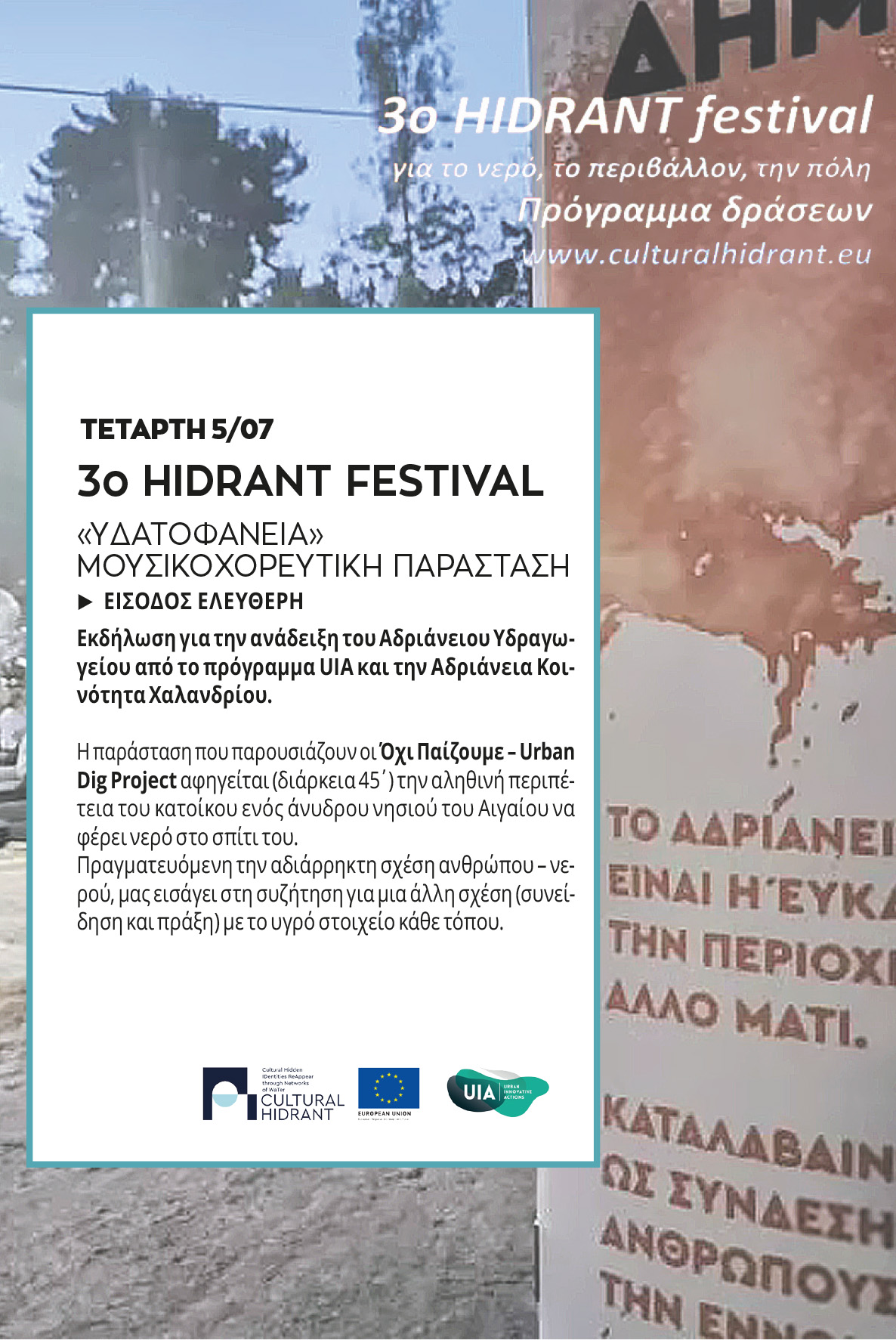 Με τη μουσικοχορετική παράσταση Υδατοφάνεια, από την ομάδα «Όχι Παίζουμε – Urban Dig Project», το HIDRANT festival έρχεται για τρίτη χρονιά φέτος στο Φεστιβάλ Ρεματιάς, την Τετάρτη 5 Ιουλίου, να μας μιλήσει για το πολυτιμότερο αγαθό μας, το νερό και την αξιοποίησή του από το Αδριάνειο Υδραγωγείο που παίρνει και πάλι ζωή στην πόλη.