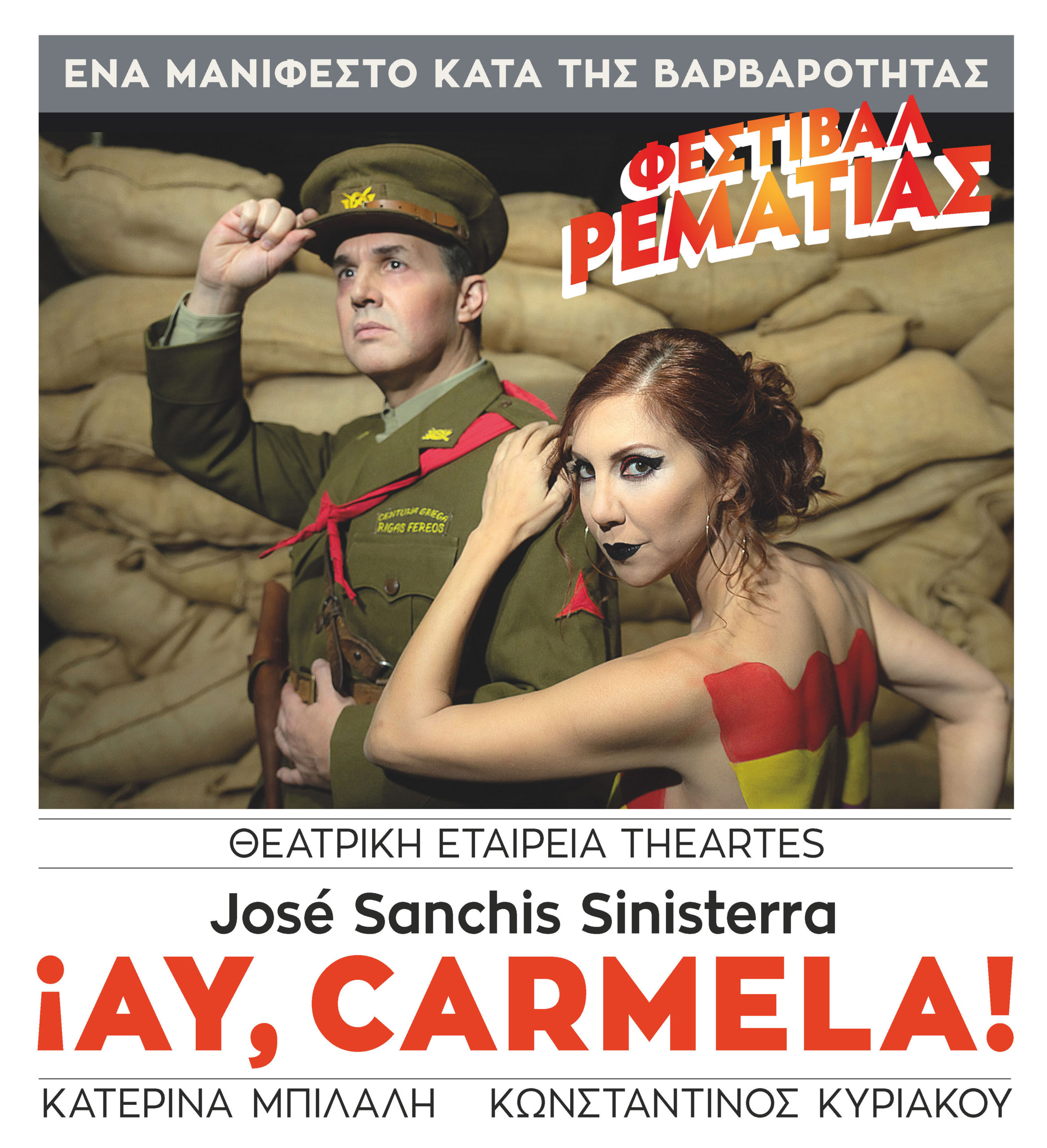 Το κωμικοτραγικό θεατρικό έργο Ay, Carmela! του Χοσέ Σάντσις Σινιστέρρα παρουσιάζει στο Φεστιβάλ Ρεματιάς 2023 – Νύχτες Αλληλεγγύης, τη Δευτέρα 17 Ιουλίου, η θεατρική εταιρεία THEARTES των Κωνσταντίνου Κυριακού και Κατερίνας Μπιλάλη. Πρόκειται για ένα αντιπολεμικό, έντονα αλληγορικό έργο, που διαδραματίζεται κατά την περίοδο του Ισπανικού Εμφυλίου Πολέμου και έχει ως αφετηρία το ερώτημα: Τι μπορεί να συμβεί όταν βρεθείς στη λάθος πλευρά της ιστορίας και πόσα είσαι διατεθειμένος να κάνεις στον βωμό της ελευθερίας (σου);