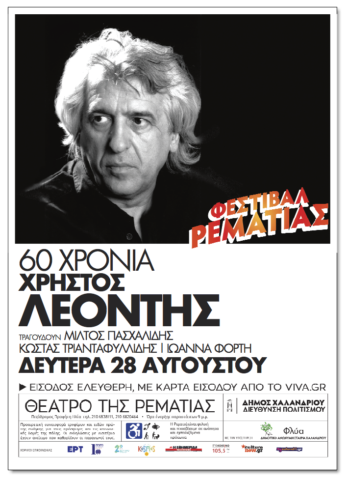 Επετειακή συναυλία για τα 60 χρόνια του Xρήστου Λεοντή στο ελληνικό τραγούδι παρουσιάζει, με την ευγενική χορηγία της ΦΛΥΑ Α.Ε., το Φεστιβάλ Ρεματιάς 2023 – Νύχτες Αλληλεγγύης τη Δευτέρα 28 Αυγούστου.