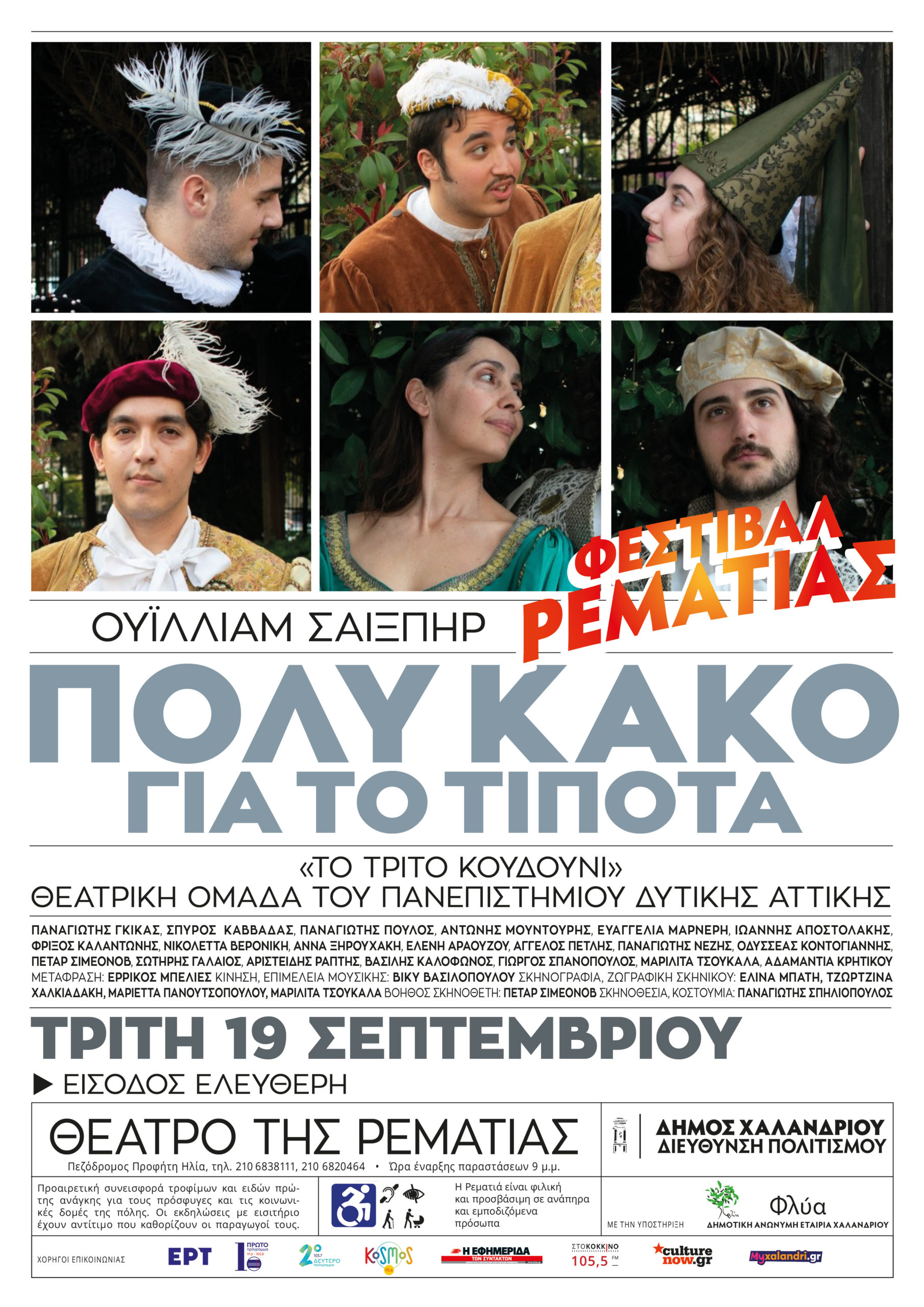 Τη θεατρική παράσταση Πολύ κακό για το τίποτα του Ουίλλιαμ Σαίξπηρ από τη θεατρική ομάδα του Πανεπιστημίου Αττικής «Το τρίτο κουδούνι» φιλοξενεί το Φεστιβάλ Ρεματιάς 2023 – Νύχτες Αλληλεγγύης την Τρίτη 19 Σεπτεμβρίου.