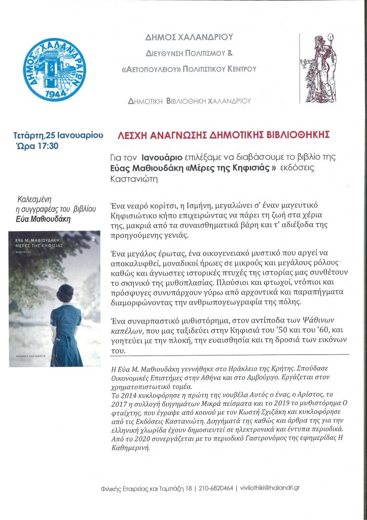Την Τετάρτη 25 Ιανουαρίου στις 17:30 μ.μ. «Μέρες της Κηφισιάς» της Εύας Μαθιουδάκη στη Λέσχη Ανάγνωσης της βιβλιοθήκης του Αετοπούλειου Πολιτιστικού Κέντρου.