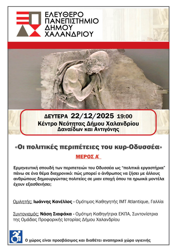 Τη  Δευτέρα 22/12 και ώρα 19:00 στο Κέντρο Νεότητας (Δαναΐδων & Αντιγόνης) το Ελεύθερο Πανεπιστήμιο του Δήμου Χαλανδρίου φιλοξενεί το πρώτο μέρος (το 2ο  μέρος 12/01) πρόκειται να  μιας πολύ ενδιαφέρουσας εκδήλωσης με θέμα: «Οι πολιτικές περιπέτειες του κυρ-Οδυσσέα».