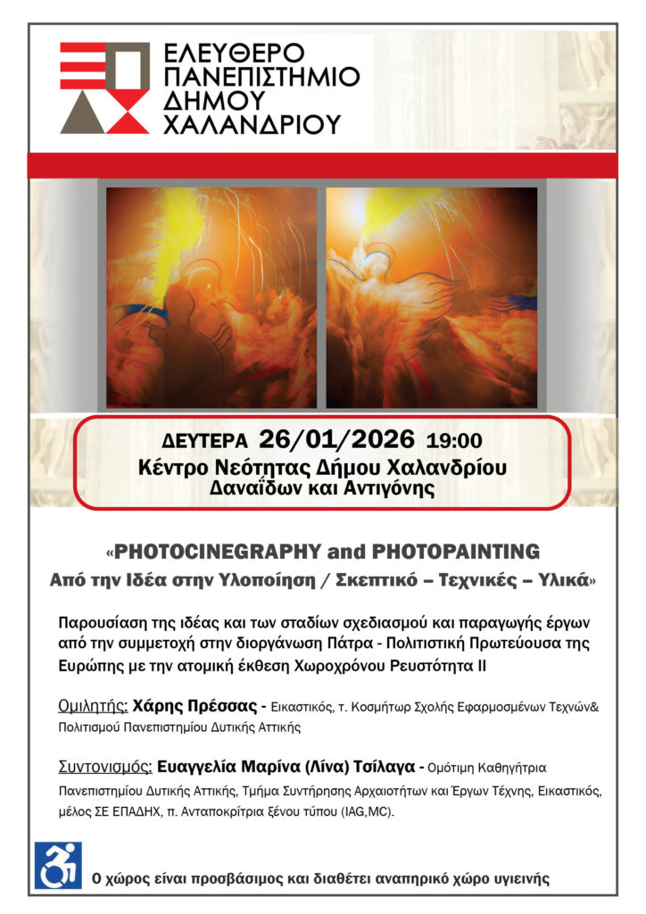 Τη Δευτέρα 26/01/2026 και ώρα 19:00 στο Κέντρο Νεότητας (Δαναΐδων & Αντιγόνης) το Ελεύθερο Πανεπιστήμιο του Δήμου Χαλανδρίου φιλοξενεί μια πολύ ενδιαφέρουσα εκδήλωση με θέμα: «PHOTOCINEGRAPHY and PHOTOPAINTING Από την Ιδέα στην Υλοποίηση / Σκεπτικό – Τεχνικές – Υλικά»