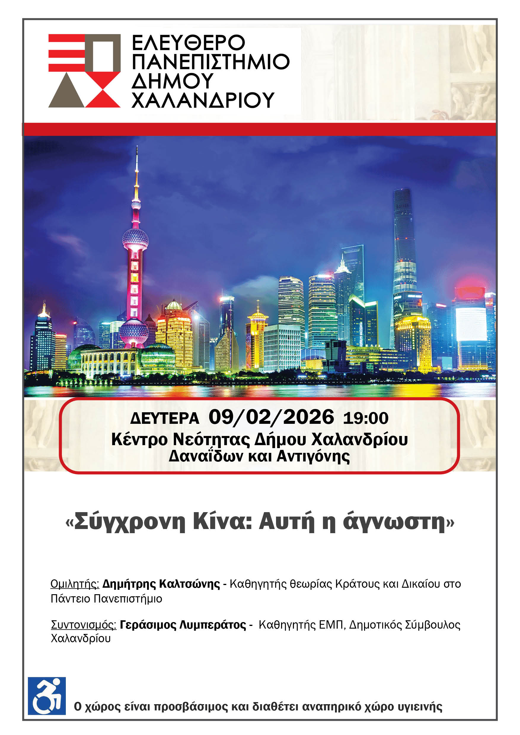 Τη Δευτέρα 09/02/2026 και ώρα 19:00 στο Κέντρο Νεότητας (Δαναΐδων & Αντιγόνης) το Ελεύθερο Πανεπιστήμιο του Δήμου Χαλανδρίου φιλοξενεί μια πολύ επίκαιρη όσο και ενδιαφέρουσα εκδήλωση με θέμα: «Η σύγχρονη Κίνα: Αυτή η άγνωστη»