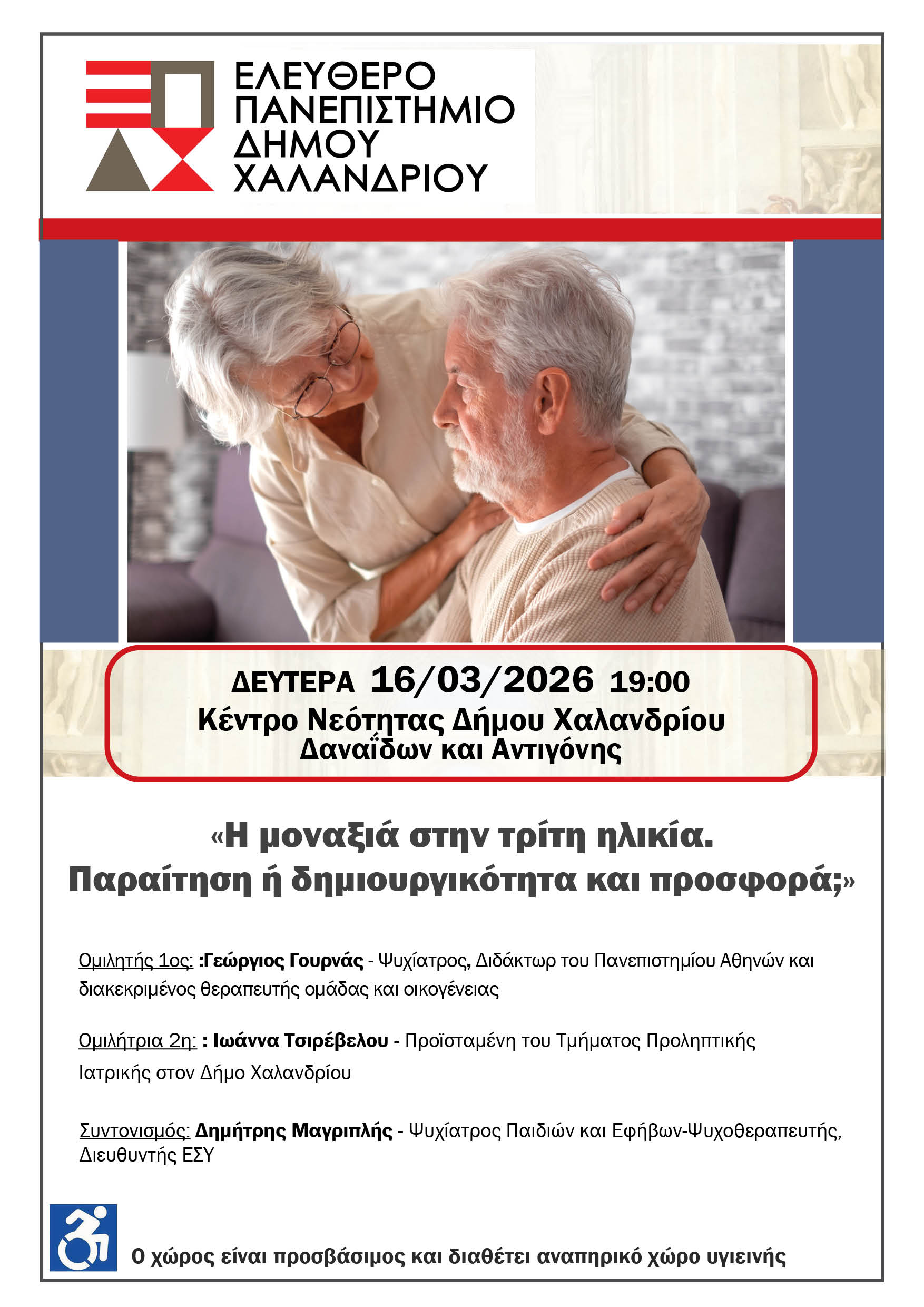 Τη  Δευτέρα 16/03/2026 και ώρα 19:00 στο Κέντρο Νεότητας (Δαναΐδων & Αντιγόνης) το Ελεύθερο Πανεπιστήμιο του Δήμου Χαλανδρίου δίνει βήμα σε ένα ευαίσθητο ζήτημα μέσα από τη διάλεξη του με θέμα: «Η μοναξιά στην τρίτη ηλικία: Παραίτηση η δημιουργικότητα και προσφορά»