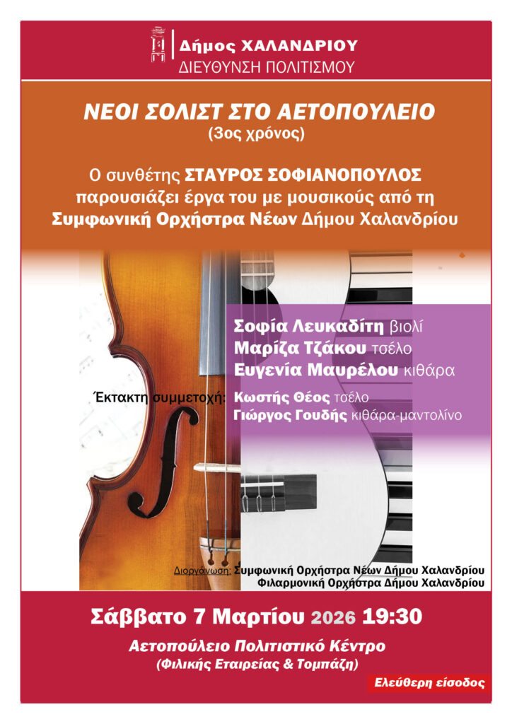 Η εκδήλωση πραγματοποιείται το Σάββατο 7 Μαρτίου στις 19.30 στο Αετοπούλειο Πολιτιστικό Κέντρο Δήμου Χαλανδρίου (Φιλικής Εταιρείας & Τομπάζη 18).