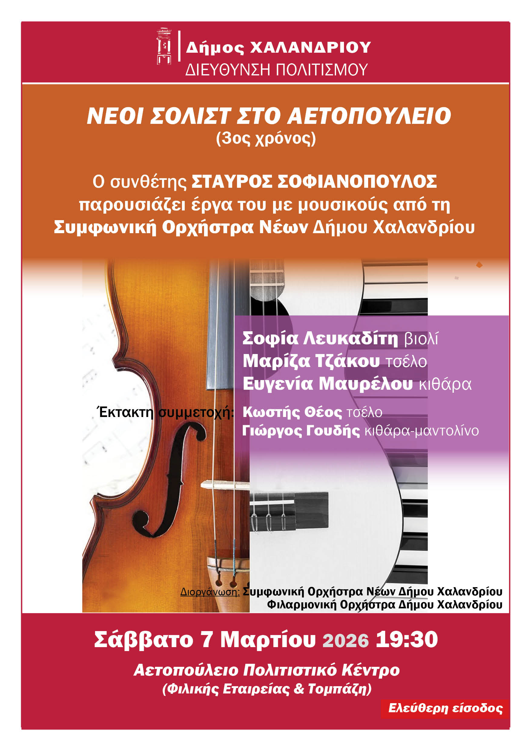 Συνεχίζεται ο τρίτος κύκλος της σειράς εκδηλώσεων «Νέοι σολίστ στο Αετοπούλειο», με μια ξεχωριστή συναυλία αφιερωμένη στο έργο του συνθέτη Σταύρος Σοφιανόπουλος, ο οποίος παρουσιάζει συνθέσεις του σε συνεργασία με νέους μουσικούς από τη Συμφωνική Ορχήστρα Νέων Δήμου Χαλανδρίου.