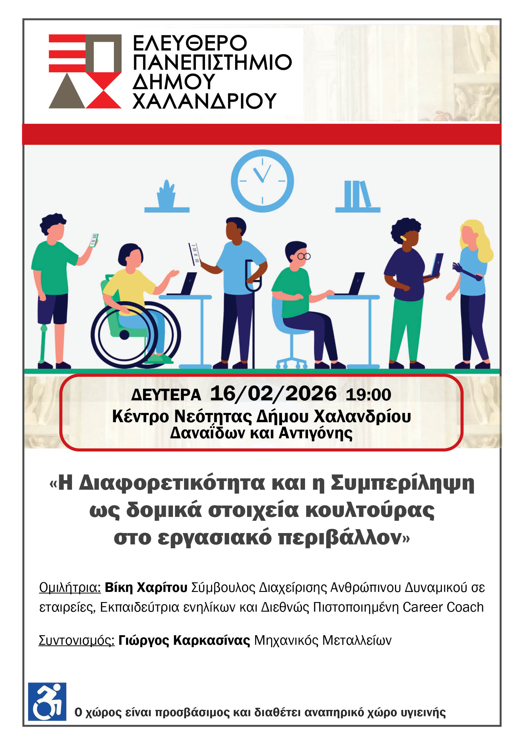 Τη  Δευτέρα 16/02/2026 και ώρα 19:00 στο Κέντρο Νεότητας (Δαναΐδων & Αντιγόνης) το Ελεύθερο Πανεπιστήμιο του Δήμου Χαλανδρίου φιλοξενεί μια πάρα πολύ επίκαιρη και σπουδαίας σημασίας διάλεξη, με θέμα: «Η Διαφορετικότητα και η Συμπερίληψη ως δομικά στοιχεία κουλτούρας στο εργασιακό περιβάλλον».