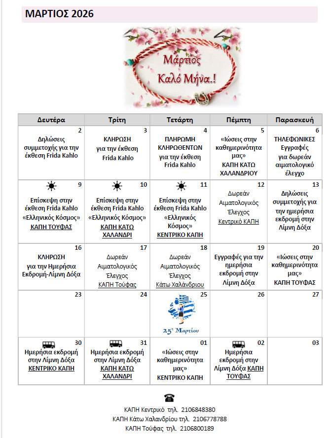 Τα ΚΑΠΗ του Δήμου Χαλανδρίου ανακοινώνουν το πρόγραμμα δράσεων του Μαρτίου 2026.