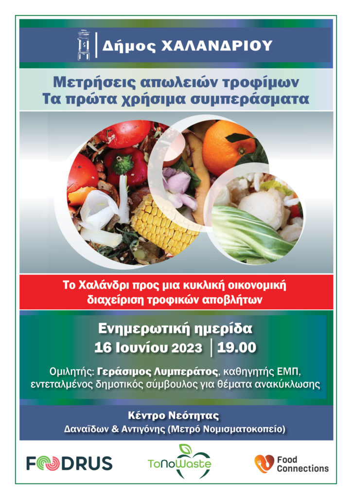Τα πρώτα αποτελέσματα από τις μετρήσεις που διενεργεί η Μονάδα Αποτροπής Απωλειών και Δημιουργίας Τροφικών Αποβλήτων, στο πλαίσιο των τριών ευρωπαϊκών προγραμμάτων HORIZON 2020, HORIZON, Erasmus+ με την ονομασία FOODRUS, ToNoWaste και Food Connections αντιστοίχως, θα παρουσιαστούν την Παρασκευή 16 Ιουνίου, στις 19.00, στην ημερίδα που θα γίνει στο Κέντρο Νεότητας του Δήμου Χαλανδρίου (Δαναΐδων & Αντιγόνης), με κεντρικό ομιλητή τον εντεταλμένο δημοτικό σύμβουλο για θέματα ανακύκλωσης, κ. Γεράσιμο Λυμπεράτο.