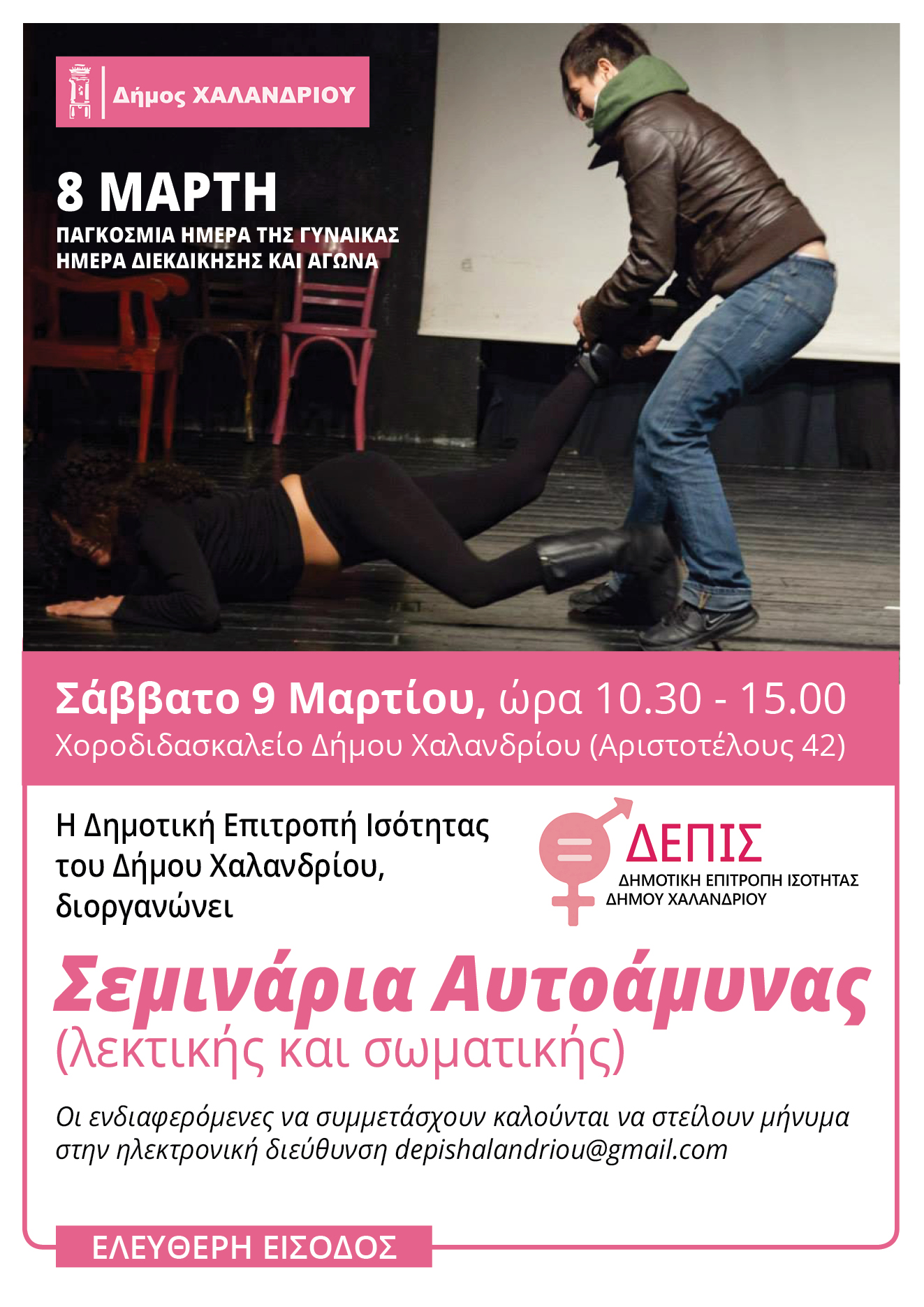 Το σεμινάριο διεξάγεται δωρεάν από τη γυναικεία ομάδα αυτοάμυνας της Άντας Τσαρέα, στην αίθουσα χοροδιδασκαλείου του Δήμου Χαλανδρίου (Αριστοτέλους 42), από 10.30 έως 15.00.