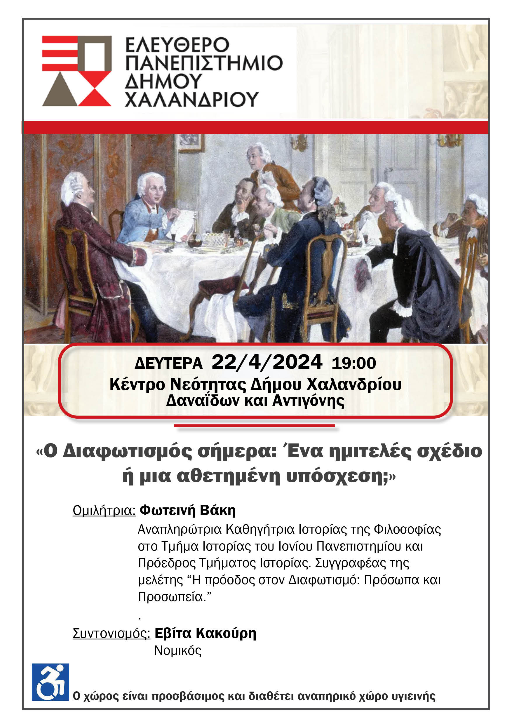 Τη Δευτέρα 22/04 και ώρα 19:00 στο Κέντρο Νεότητας Χαλανδρίου Δαναΐδων και Αντιγόνης ανοίγει η συζήτηση με θέμα: «Ο Διαφωτισμός σήμερα: Ένα ημιτελές σχέδιο ή μια αθετημένη υπόσχεση;».