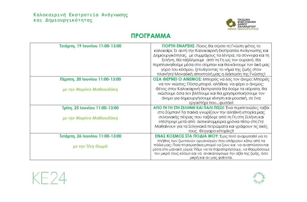 Η Παιδική Βιβλιοθήκη «Μίμης Βασιλόπουλος» του Δήμου Χαλανδρίου ως μέλος του Δικτύου των Ελληνικών Βιβλιοθηκών της Εθνικής Βιβλιοθήκης της Ελλάδος συμμετέχει για 12η συνεχόμενη χρονιά στην Καλοκαιρινή Εκστρατεία Ανάγνωσης και Δημιουργικότητας 2024.